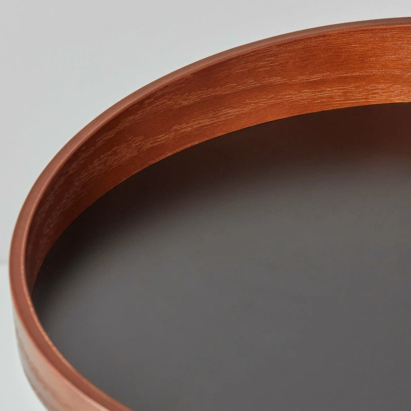 The versatile Crater End Table features a sturdy black matte black metal base, a painted black MDF table top, and oak wood veneer rim. This wooden rim is uneven in height around the table top offering a unique, mid-century modern look while providing a secure environment for valuables.