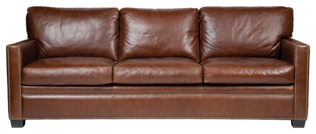The Transitional Sofa adds warmth and a stately feel to your design with its rich brown leather upholstery and clean-lined look. Attractive low track arms are emphasized with decorative nailhead trim that also offers its design an urban touch. The Transitional feels equally at home in your downtown loft as it does your rustic lodge.