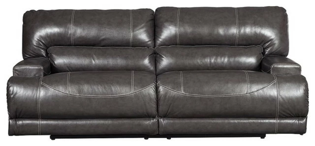 Sink into the supple McCaskill reclining sofa and prepare to be swept off your feet—literally. Extra-wide seats and plush cushioning are divinely comfortable. The seating area is wrapped in our decadently soft leather for a luxurious experience, while a perfect leather-match upholstery on the exterior saves you money without sacrificing style. Prominent stitching, linear track arms and a goes-with-anything gray hue add stylish touches.