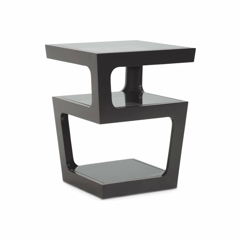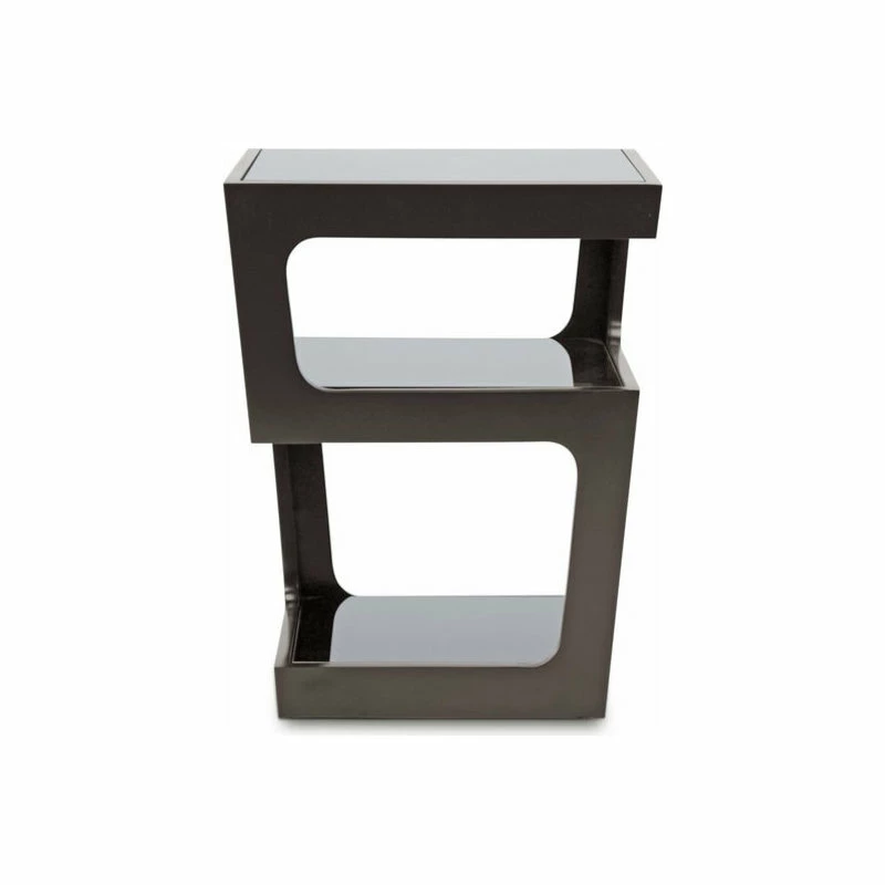 A unique contemporary side table option, this designer piece offers triple tinted tempered glass surfaces for sophisticated storage and display. The black engineered wood frame descends from the top surface to the bottom in two opposite corners for each level, leaving each space with a wider gap for easy access. The design includes a width that tapers as it descends from top to bottom. The Clara End Table is fully assembled: just position the glass in place. Maintain the table’s beauty by simply wiping the glass surfaces with a glass cleaning solvent and a soft cloth; the frame should be dusted with a dry cloth. Product dimension:17″W x 17″D x 21. 75″H