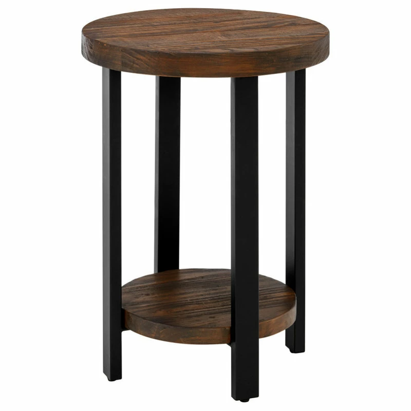 The Pomona collection features the exquisite workmanship of a solid wood top with metal legs that will last for years to come. Each piece is constructed of solid pine wood and finished to have the appearance of reclaimed wood. The reclaimed wood finish highlights natural wood variations such as cracks and knots which add to the piece’s character. Any item in this collection will add to the rustic industrial style of any space. Pomona Round End Table fits any small space. The 20 inch diameter table offers 2 levels of pure beauty. Place your favorite lamp on top and add a vase, plant, or books on the lower shelf to complete this beautiful design. Its solid Pine wood tops look like reclaimed wood. Knots, cracks and imperfections add to the character of your piece. Strong, powder-coated steel legs make a statement in your living space.