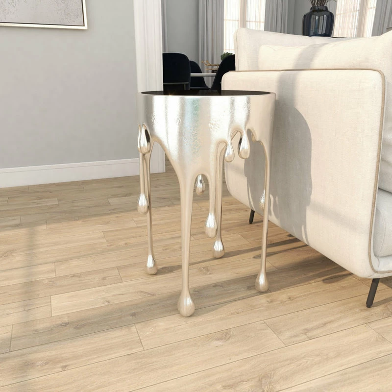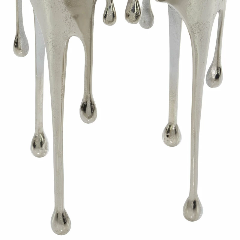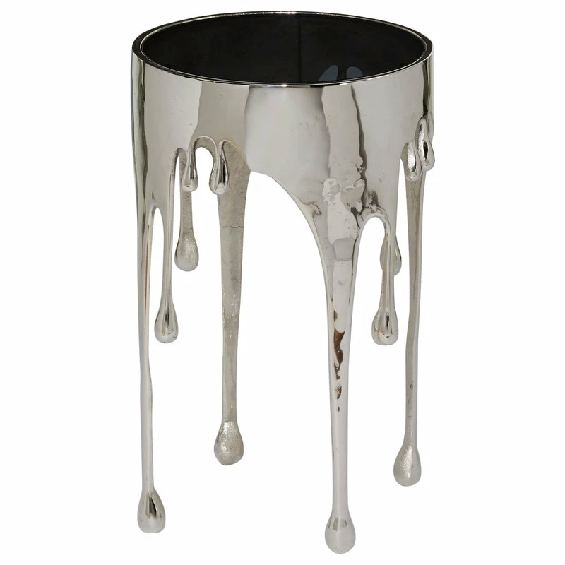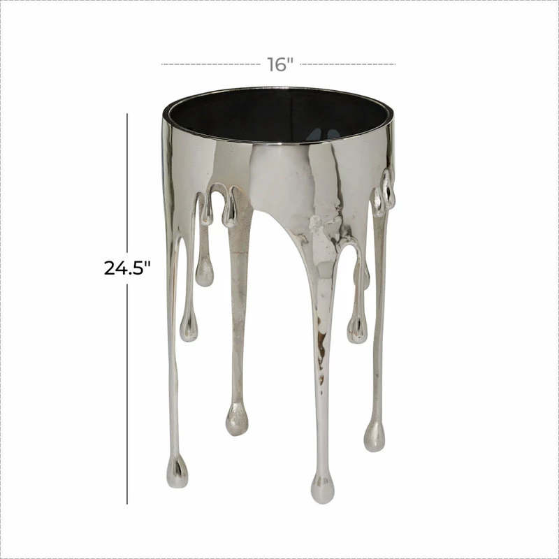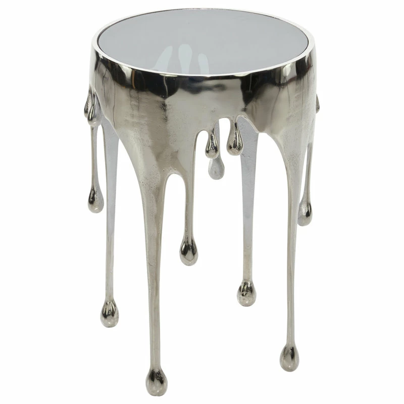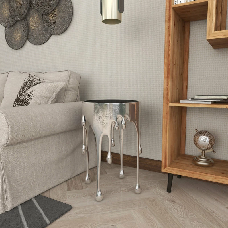 Bring a finishing touch to your home with an inviting appeal with this beautifully crafted accent table. A compact friendly table providing you with additional surface storage space any where in your home. Create a fun-filled art installation in your home as you decorate this melting silver aluminum table with bold colored furniture and thick shag carpets. This item ships in 1 carton. Features easy to clean and stylish smoked glass table top. Suitable for indoor use only. Maximum weight limit is 100 lbs. Made in India. This is a single accent table. Contemporary style.