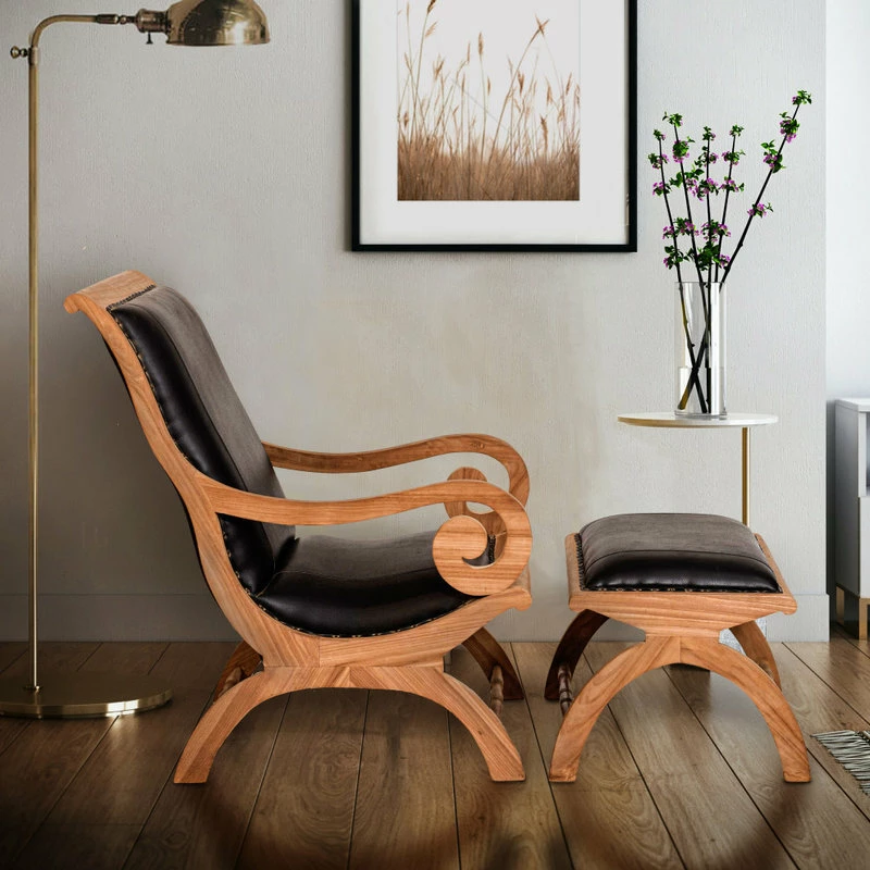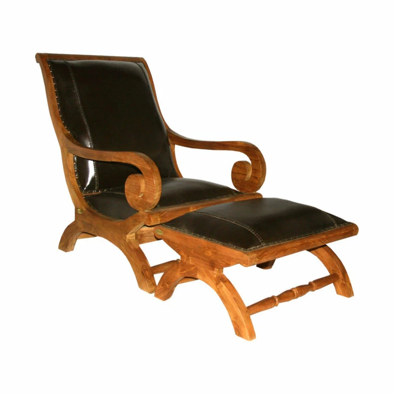 Relax and dream away in this very comfortable Teak and Leather Bahama Chair with Ottoman. Made from the highest quality teak and leather, this chair and ottoman will become your favorite spot in the house to relax. The quality craftsmanship that went into this chair is truly unmatched. The curved style found in the arms and legs really make this chair stand out. Beautiful classic rivets were used to secure the leather around the edges.