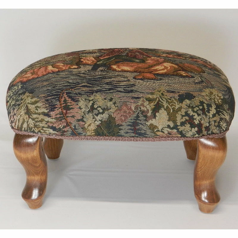 Queen Anne Footstools are hand made in the US with great materials and workmanship and feature fine tapestries depicting many popular nature, sports, animal and outdoors themes such as Golf, Fishing, Polo and Hunting. The padded top is framed in a 1/2″-wide gimp trim and rests on four elegant solid wood Queen Anne legs. Dimensions are: 16″ by 12″ by 10″ high, Filling material: 100% polyurethane foam; No assembly required. This footstool simply brings comfort to the feet and joy to the eye and will make an excellent gift.