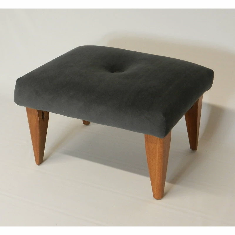This US-made and hand crafted footstool was inspired by the simplicity and elegance of the mid-20th century designs and features a rectangular upholstered seat with a single tufted button in the center. The top rests on four solid hardwood tapered legs, finished in a medium brown color. Dimensions are: 16″ by 12″ by 10″ high and the weight is about 4 pounds. Filling material is 100% polyurethane foam and no assembly is required. This footstool is available in seven colors: Black, Navy, Brown, Cr̬me, Olive, Gold, and purple.