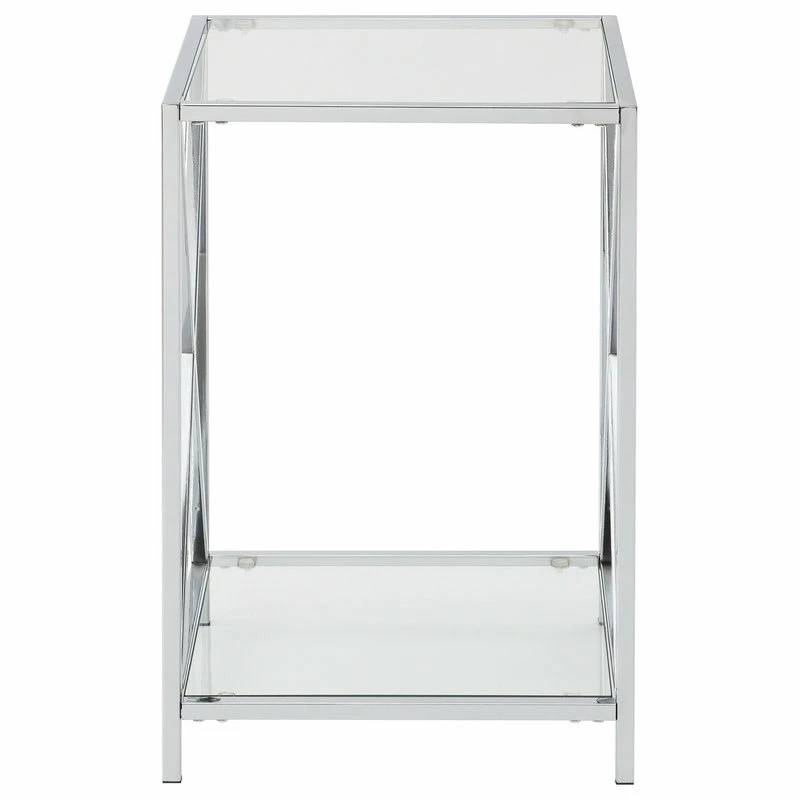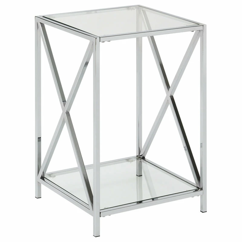 Oxford Chrome End Table with ShelfBring home a classic look with the Oxford Chrome End Table with Shelf from Convenience Concepts. Featuring a clean lined silhouette and two tiers of shelving, this piece beautifully boasts an open concept design. With its tempered clear glass shelves and chrome metal frame, this end table will create a glamourous yet luxurious feel in any room. Great for showcasing your favorite collectibles in addition to stowing your entertainment essentials within reach. Easy 3-step assembly will have you enjoying your Oxford Chrome End Table with Shelf in no time. Look for coordinating pieces in the Oxford Chrome Collection from Convenience Concepts, each sold separately.