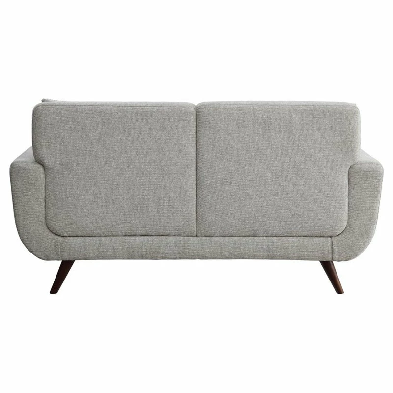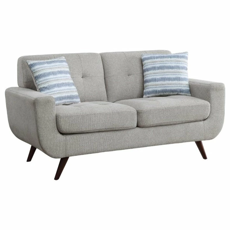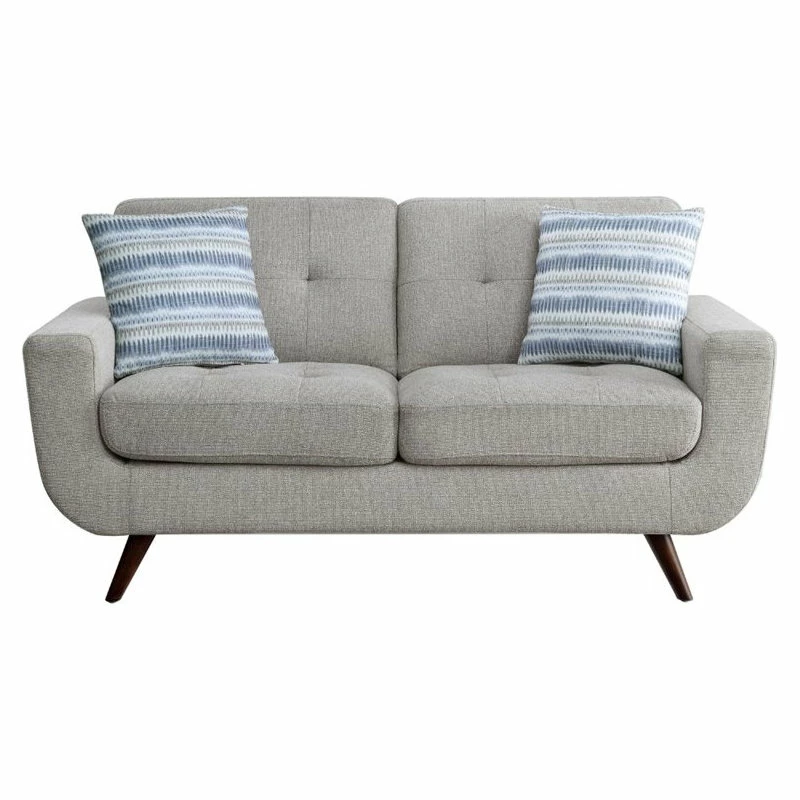 Contoured continuous framing surrounds the plush seats of the Amberley Collection, drawing inspiration from classic mid-century design, creating a sophisticated accent to your home’s living room. Coordinated toss pillows, walnut finished wood legs and the gray fabric that covers the love seat all work together to achieve the intended classic look.
