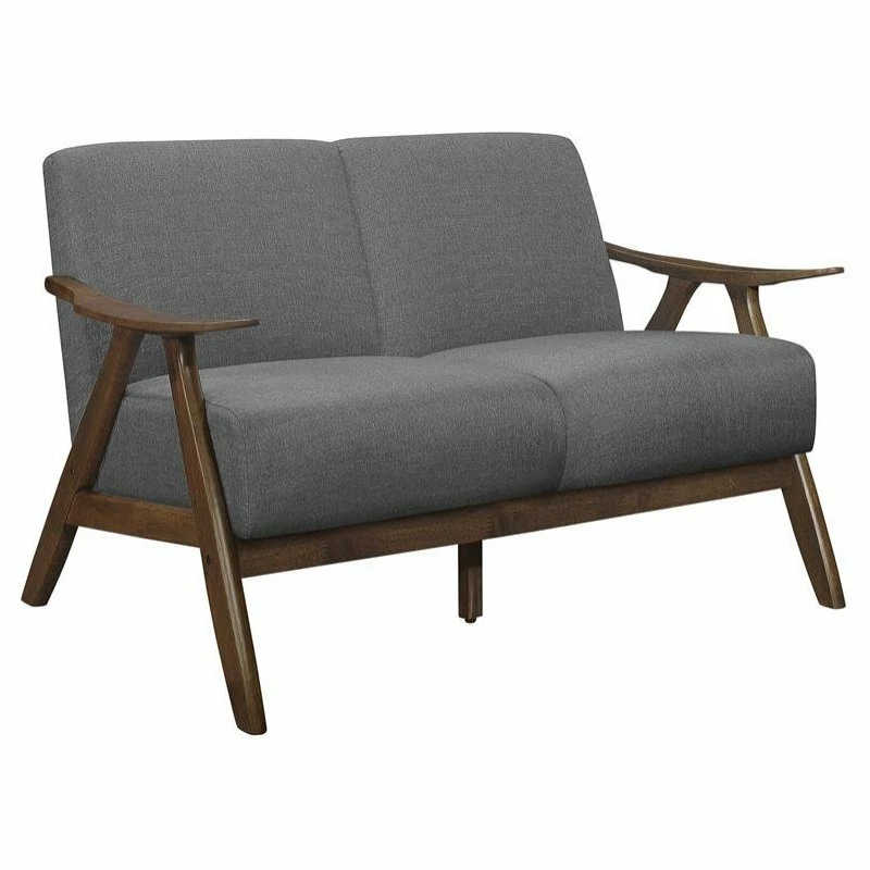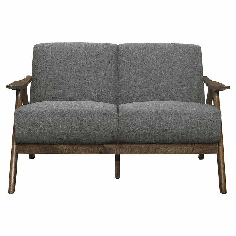 The retro-inspired wood framing of the Damala Collection will perfectly accent your modern home décor. Subtle contouring to the love seat’s wood frame is finished in walnut, presenting as a classic complement to the gray fabric that covers the padded love seat’s seat and back.