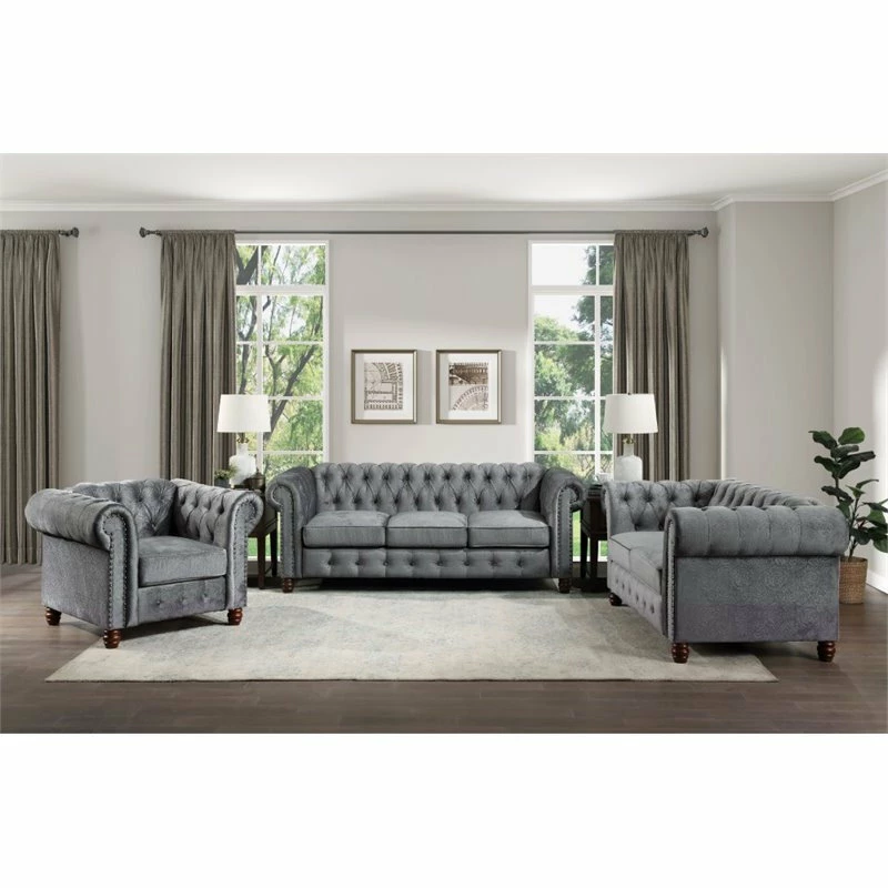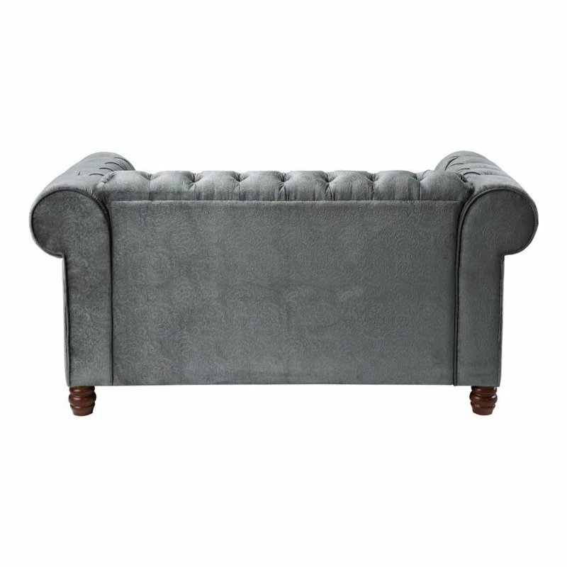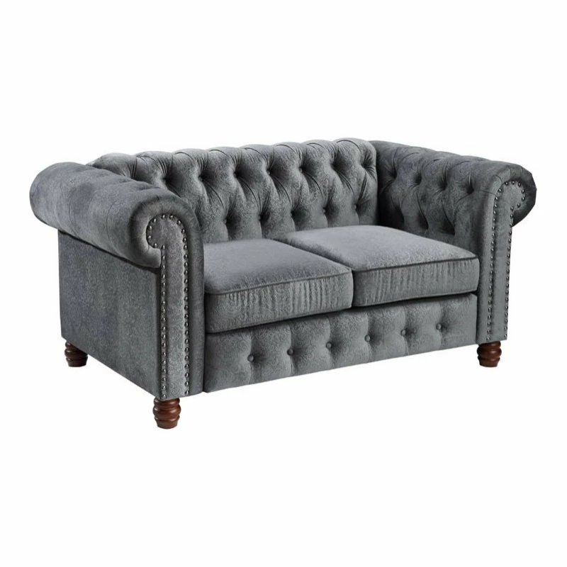 The iconic style of the Welwyn Collection exemplifies the timeless look of traditional design. This Chesterfield-style love seat is covered in dark gray velvet and features the classic accenting of button tufting, heavily rolled arms and nailhead accent. Cherry finished wood legs provide support while complementing the velvet’s neutral tone.