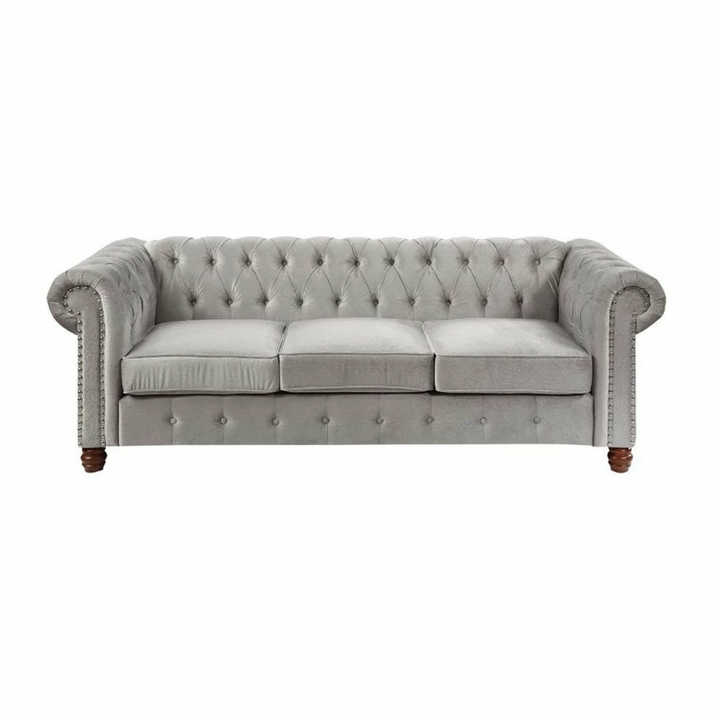The iconic style of the Welwyn Collection exemplifies the timeless look of traditional design. This Chesterfield-style sofa is covered in gray velvet and features the classic accenting of button tufting, heavily rolled arms and nailhead accent. Cherry finished wood legs provide support while complementing the velvet’s neutral tone.