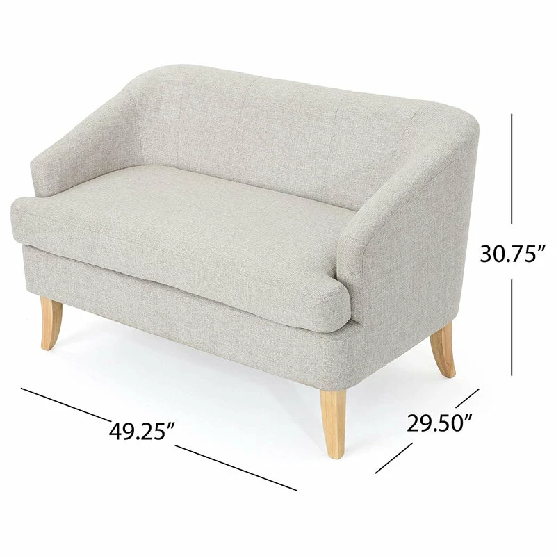 - This uniquely-shaped love Seat blends elegant design with the utmost in comfort. Perfect for those looking to add seating space without committing to a big bulky couch, This makes for an intimate and relaxing place to read a book or watch TV. Upholstered with the highest Quality fabric, and set atop beautiful birch wood legs, this will be a favored addition to your home.