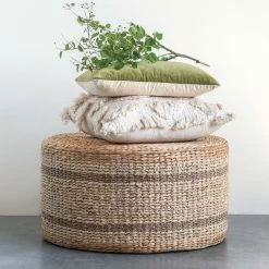 CREATIVE CO-OP Brown Striped Round Water Hyacinth And Seagrass Ottoman/Table