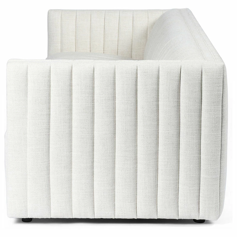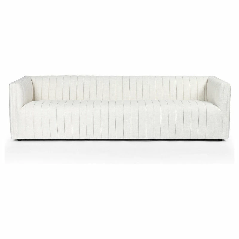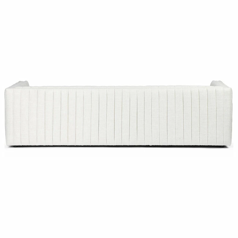 The Augustine features clean white linen-blend fabric upholstery with dramatic channel tufting for trend-forward texture and a sumptuous sit.