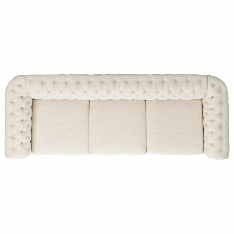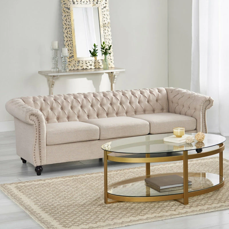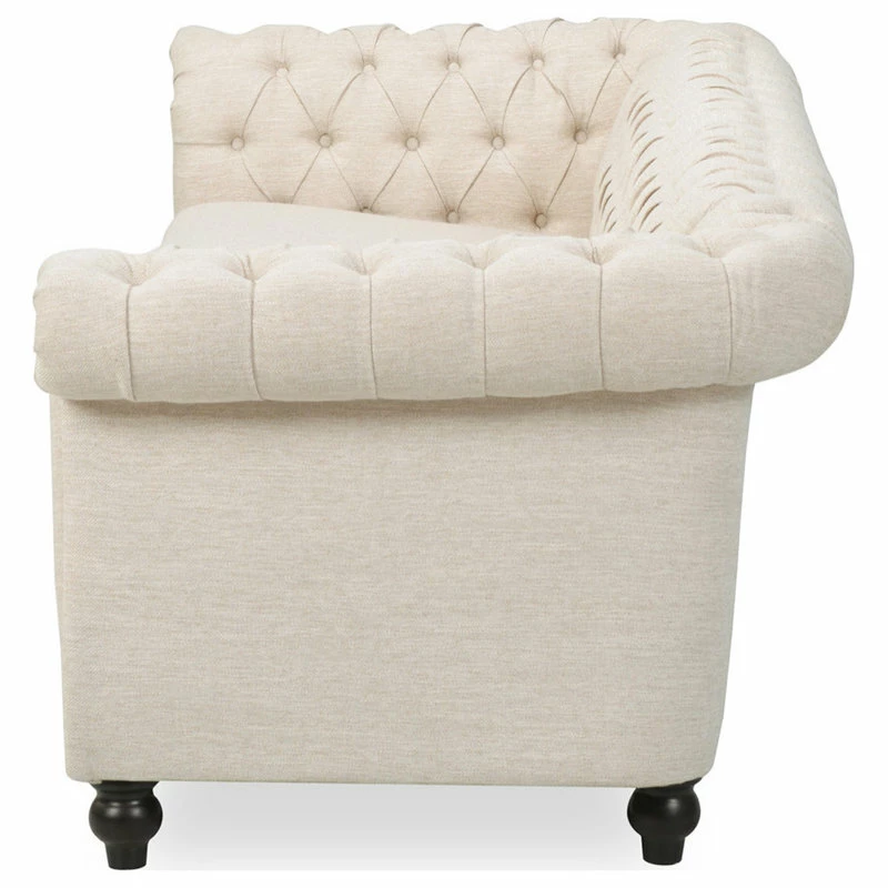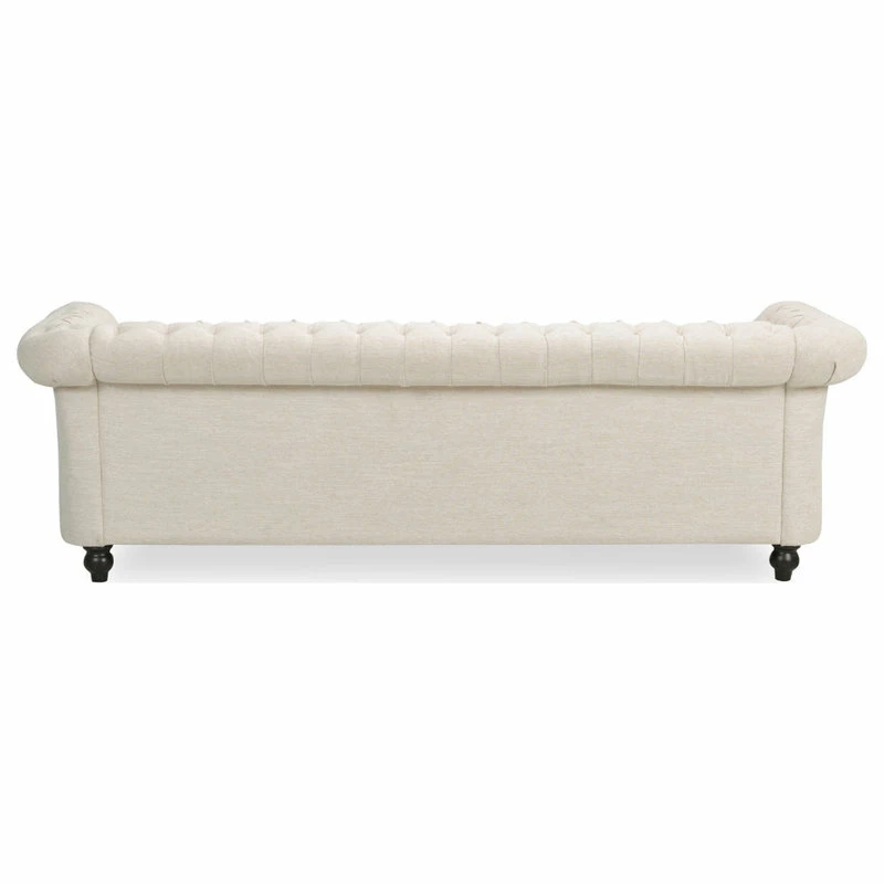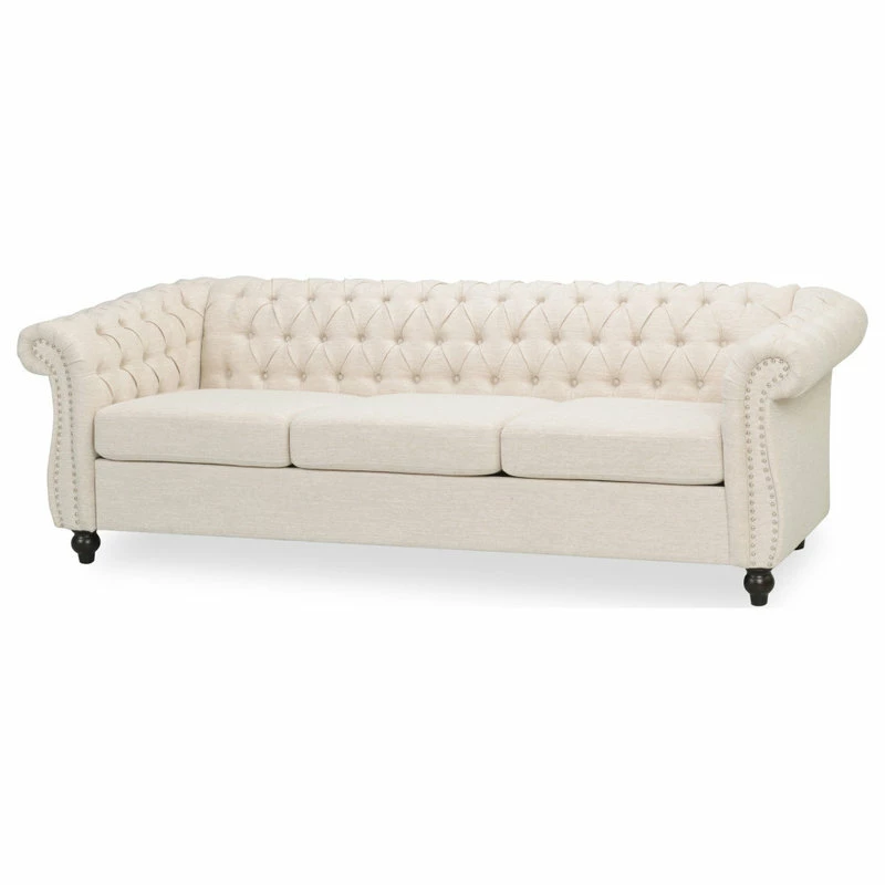 Enrich your living room with an exquisite centerpiece that practically exudes royal-like luxury. This Chesterfield style sofa is the ideal addition to any living room with its classic design and traditional elements such as deep button tufting, scrolled arms, and nailhead accents. Featuring a low backrest and plush upholstery, this sofa stands as a streamlined statement piece that can change the whole flow of your living room, creating an open, clean space. Finished with beautifully turned legs, our sofa provides an elegant touch to any room.