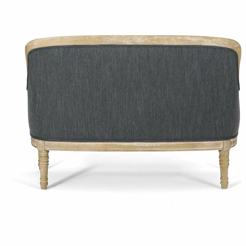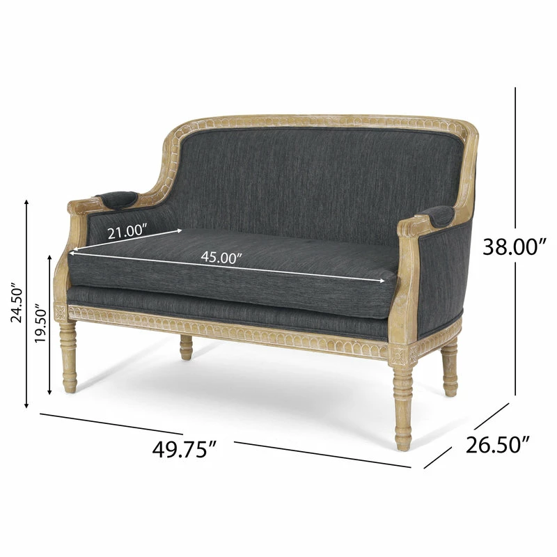 Your living room will never feel more charming and elegant with this French country-inspired loveseat! Made from environmentally friendly weathered wood, this piece is both comfortable and stylish, making it a great piece for any home. The refined appearance can be noted in the upholstered armrest, giving the entire room a sophisticated atmosphere. This loveseat is comfortable and perfect for anyone looking for an enlightened and outstanding aesthetic. This piece has lovely turned legs in order to keep the loveseat sturdy and reliable.