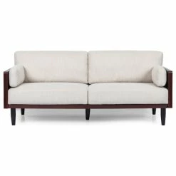 MID-CENTURY DESIGN: Blending together beautifully tapered legs with a stunning exposed wood frame, our sofa offers a mid-century look to your lounge space. With its clean lines and plush pillow style cushions, this sofa uses new materials to reimagine a traditional design.