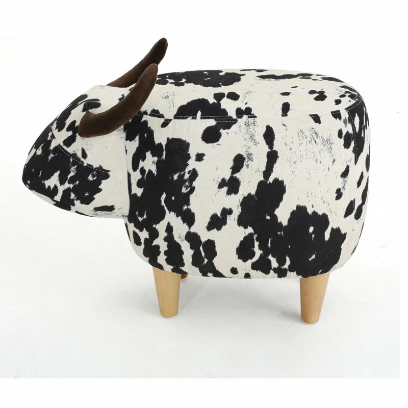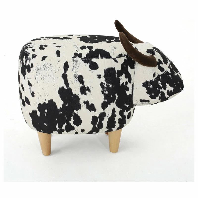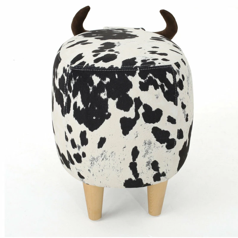 Coordinate a cute and unique design scheme with help from our precious cow ottoman. Designed to look like a faceless, yet still lovable cow, this ottoman is sure to bring out your inner child. The quirky footstool ottoman is ideal for your child’s playroom or any other fun, eclectic room. The spotted surface adds pattern and contrast to your space, horns add even more detail, and tapered legs tie the piece together. Embrace your playful side with our charming and adorable cow ottoman.