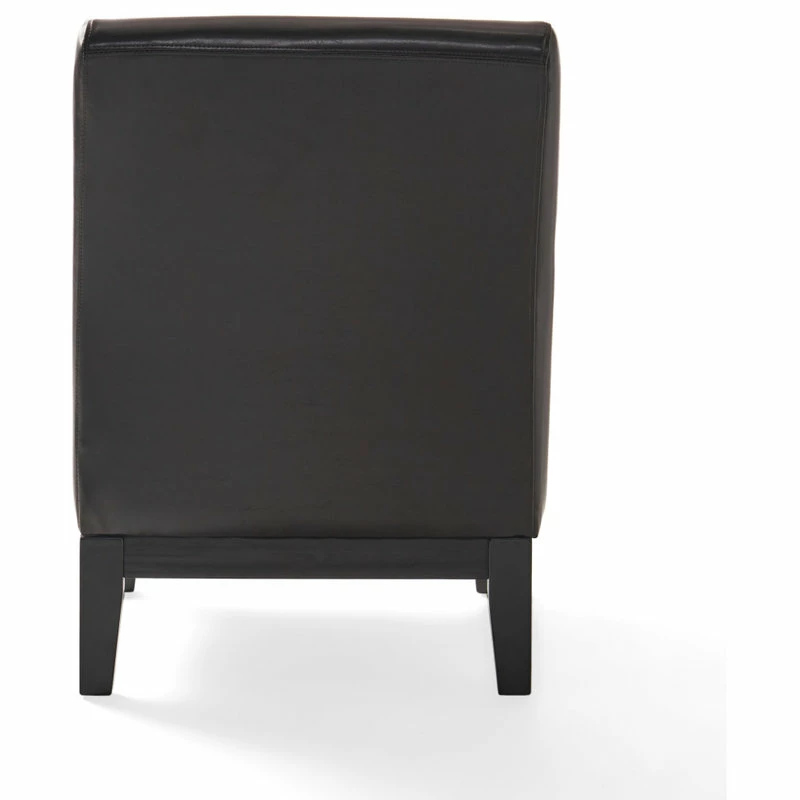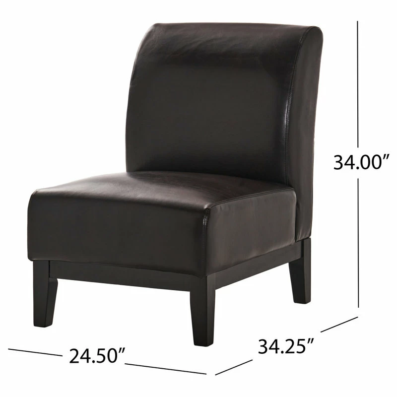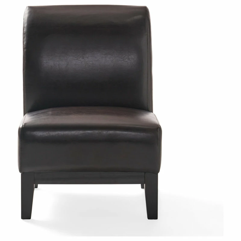 The Braker Brown Slipper Chair is upholstered in smooth brown bonded leather and stands on brown wooden legs. Its size, simplicity and stylish design make this piece perfect for any small space.