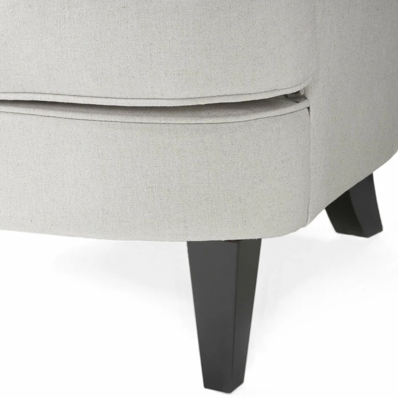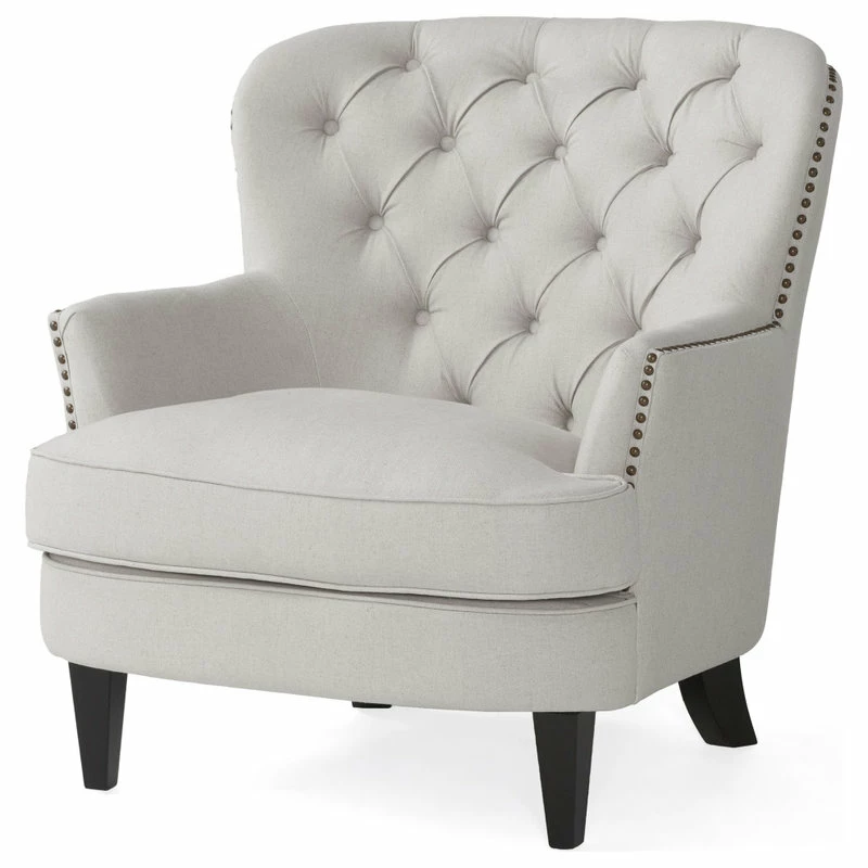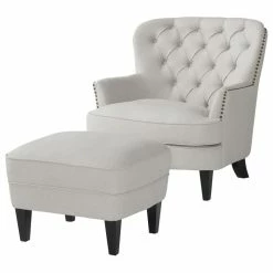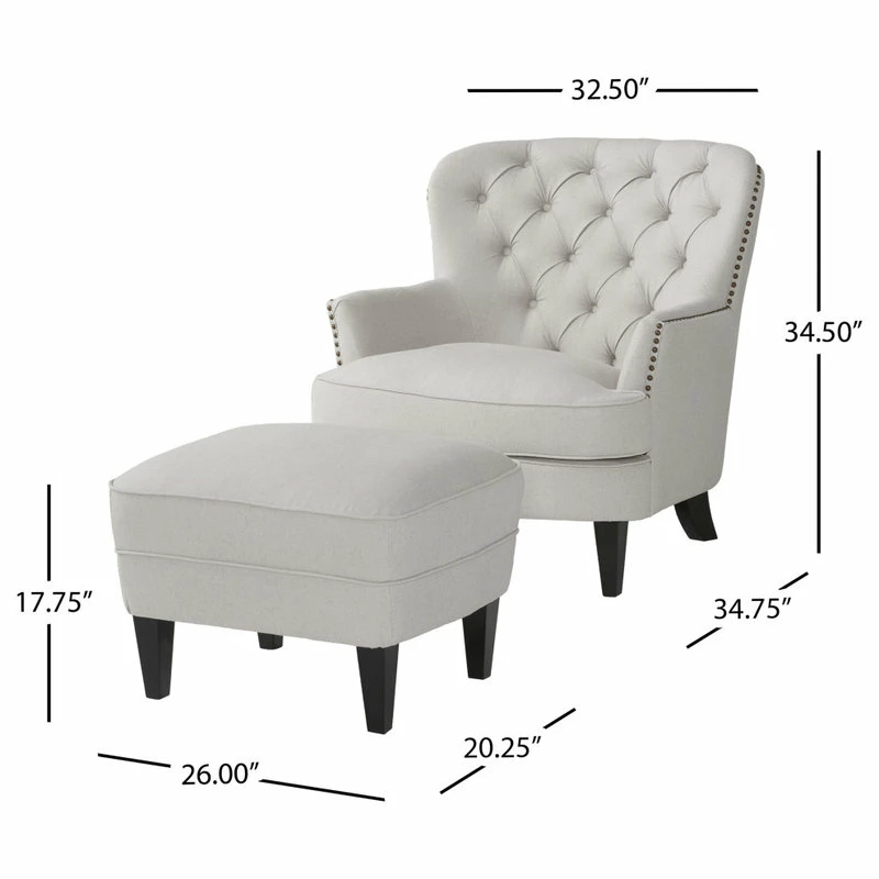 Add comfort to your living room and charm to your sitting area with our versatile club chair and ottoman set. Boasting smooth, lovely, diamond-tufted upholstery and a soft cushion, this contemporary chair invites you to take a seat. Nailhead trim and tapered legs ensure that no detail is forgotten. Completed by a curvaceous, traditional silhouette and a matching ottoman, the set is pretty and practical. Design a quaint little reading and conversation nook, or use this set in your living room for added seating.