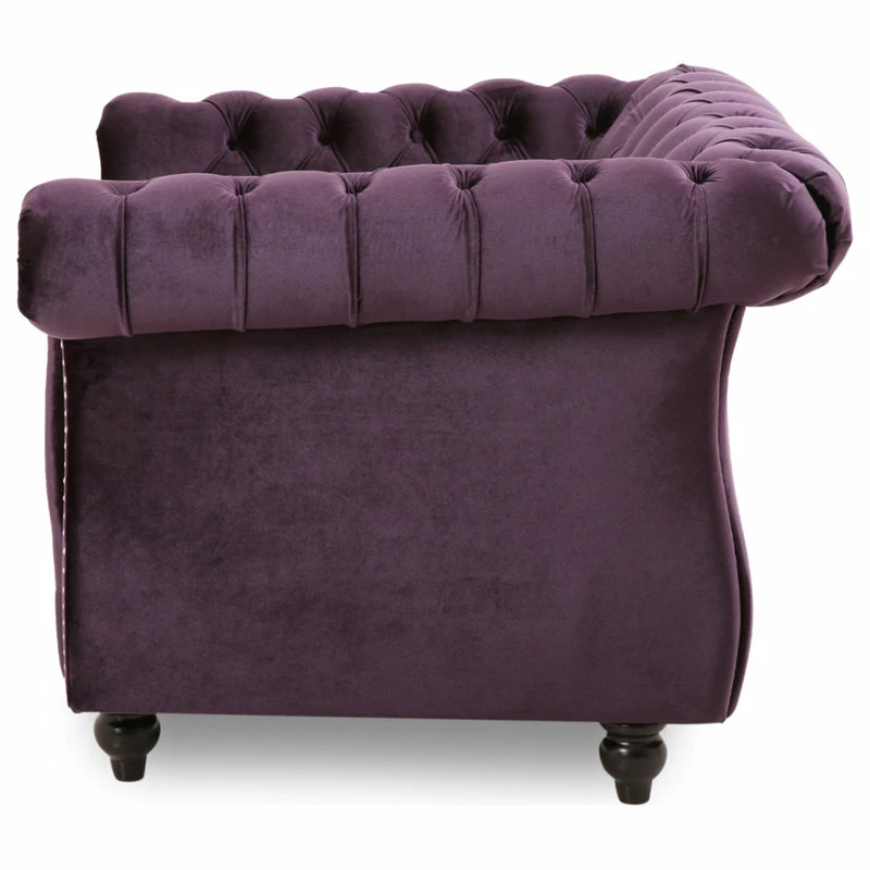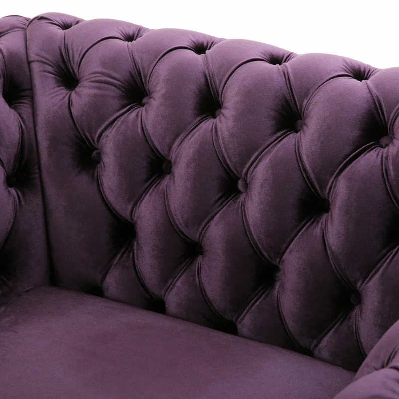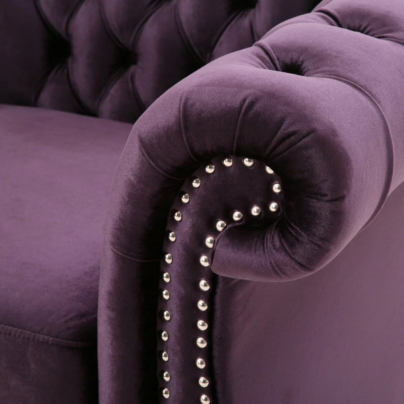 CHESTERFIELD INSPIRATION: Designed with the traditional Chesterfield style in mind, this piece hits all the key elements, with soft velvet upholstery, deep button tufting, nailhead accents, scrolled arms, and turned legs.