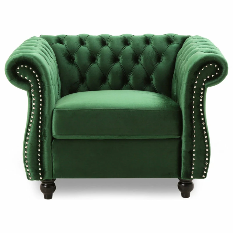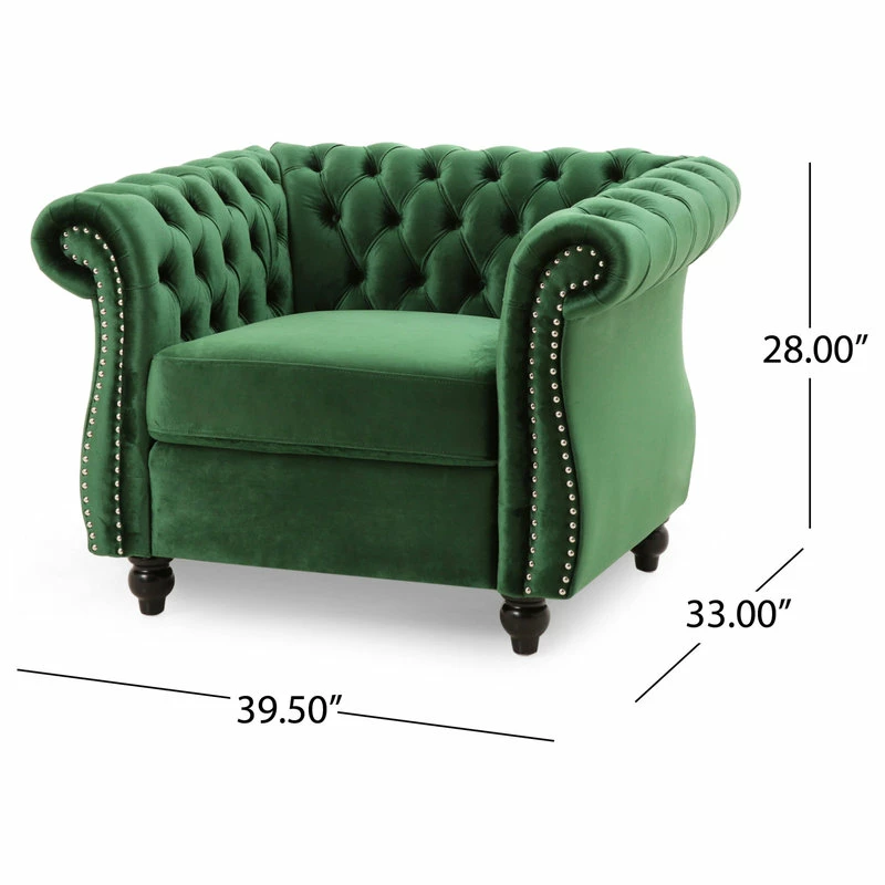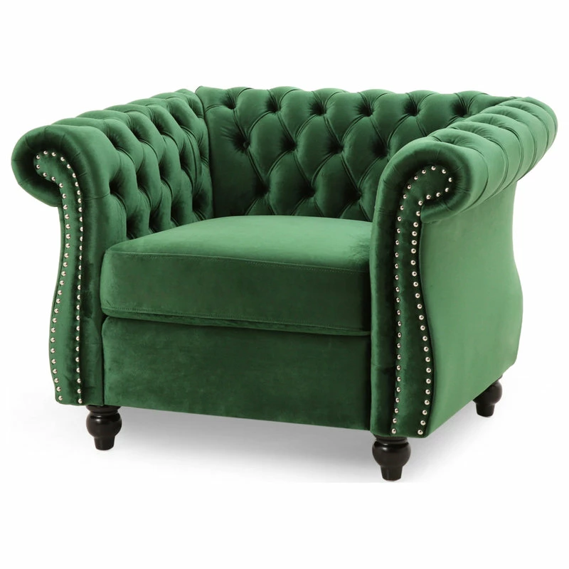Live a life of luxury with a club chair that gives you everything from incredible textures to exquisite style. This Chesterfield inspired club chair is the ideal addition to any living room with its classic design and traditional elements such as deep button tufting, scrolled arms, and nailhead accents. Featuring soft velvet upholstery, this chair stands as a streamlined statement piece that can change the whole flow of your living room, creating an open, clean space. Finished with beautifully turned legs, our club chair provides an elegant touch to any room.