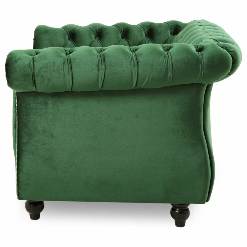 CHESTERFIELD INSPIRATION: Designed with the traditional Chesterfield style in mind, this piece hits all the key elements, with soft velvet upholstery, deep button tufting, nailhead accents, scrolled arms, and turned legs.