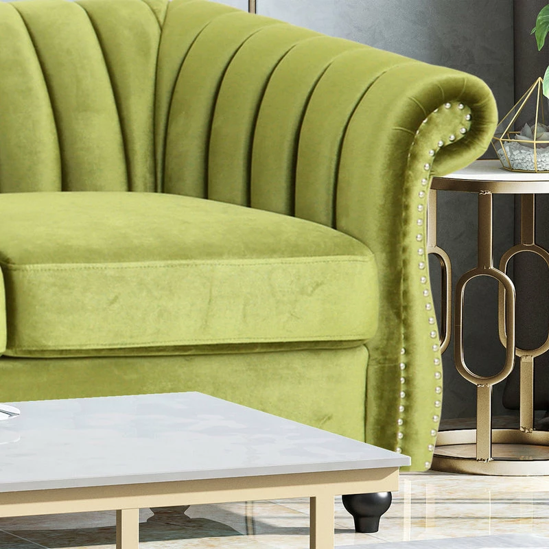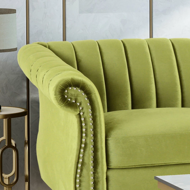 Present your home in modern luxury with a centerpiece sofa that exudes a glamorous vibe at every angle. Our Chesterfield-inspired sofa is the ideal addition to any living room with its classic design and traditional elements such as scrolled arms, turned legs, and nailhead accents. Upgraded with a sleek modern touch of channel tufting, this three-seater sofa brings you an undeniably elegant touch to your interior space. Featuring soft velvet upholstery, this sofa stands as a streamlined statement piece that can change the whole flow of your living room.