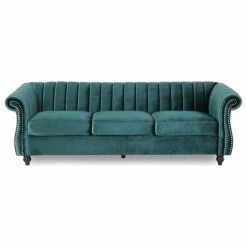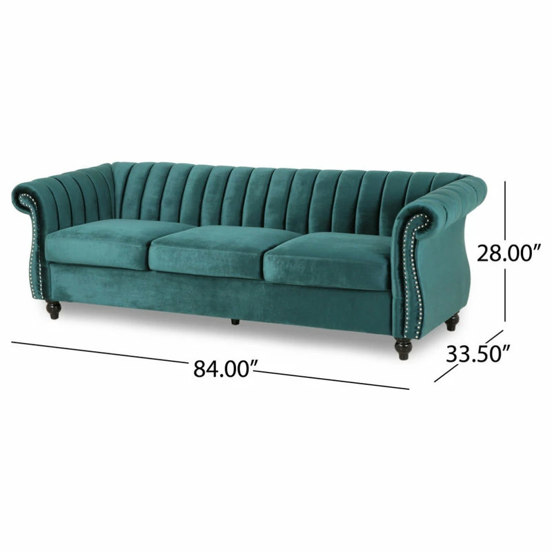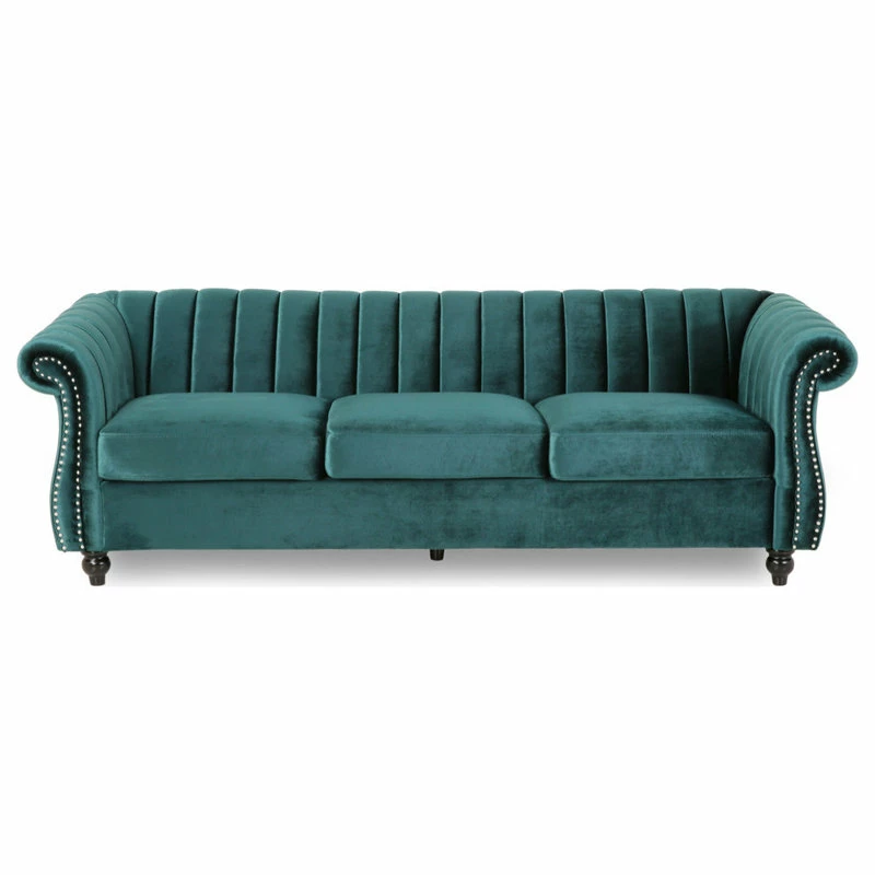 Present your home in modern luxury with a centerpiece sofa that exudes a glamorous vibe at every angle. Our Chesterfield-inspired sofa is the ideal addition to any living room with its classic design and traditional elements such as scrolled arms, turned legs, and nailhead accents. Upgraded with a sleek modern touch of channel tufting, this three-seater sofa brings you an undeniably elegant touch to your interior space. Featuring soft velvet upholstery, this sofa stands as a streamlined statement piece that can change the whole flow of your living room.
