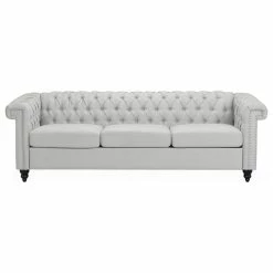 Bring home a timeless addition for your living room with our lasting Chesterfield style sofa. This lovely sofa is the ideal addition to any living room with its classic design and traditional elements such as deep button tufting, and nailhead accents. Featuring a low backrest and plush upholstery, this sofa stands as a streamlined statement piece that can change the whole flow of your living room, creating an open, clean space. Finished with beautifully turned legs, our sofa provides an elegant touch to any room.