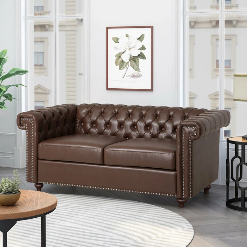 Grace your home with refinement and comfort with a single addition. This classic loveseat is the ideal addition to any interior space with its traditional design and elegant elements such as beautifully turned legs and outstanding Greek key arms. Featuring smooth upholstery, this loveseat stands as a streamlined statement piece that can change the whole flow of your living room, creating an open, clean space. Finished with a gorgeous nailhead trim and lovely button-tufted stitching, our loveseat provides a sophisticated touch to any room.