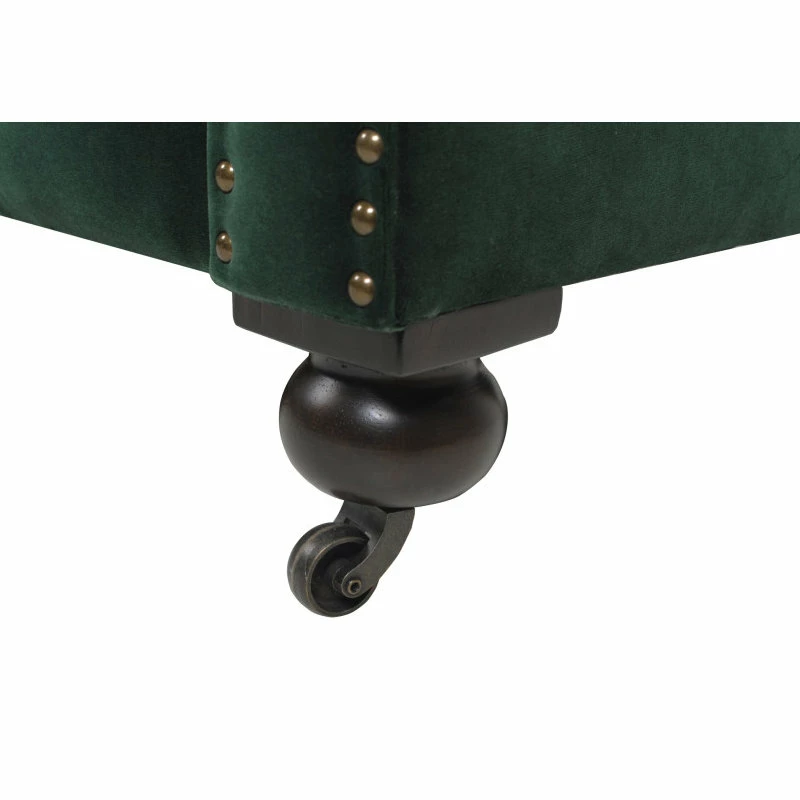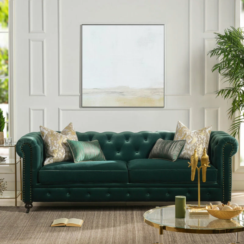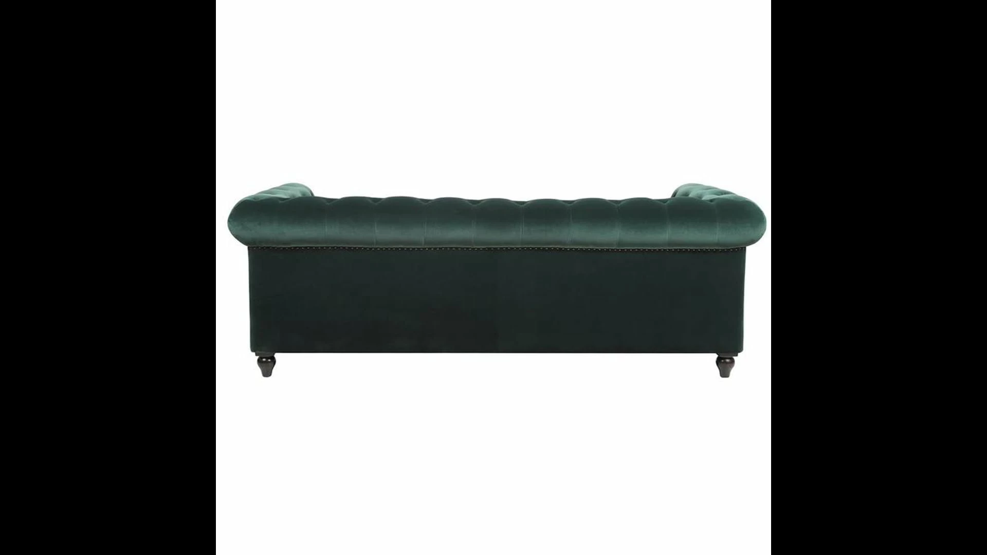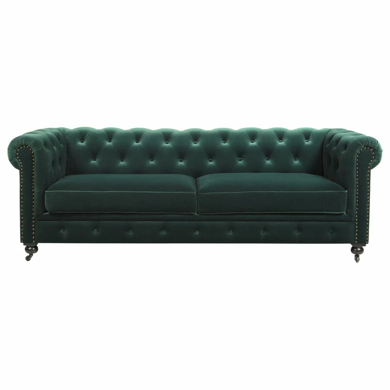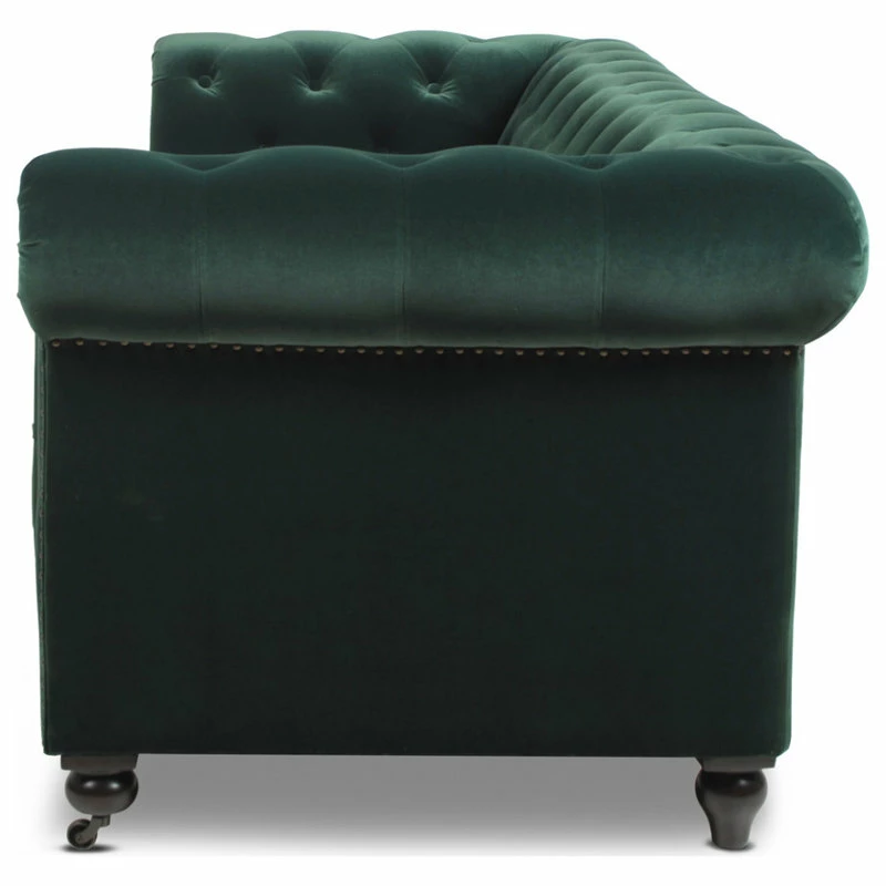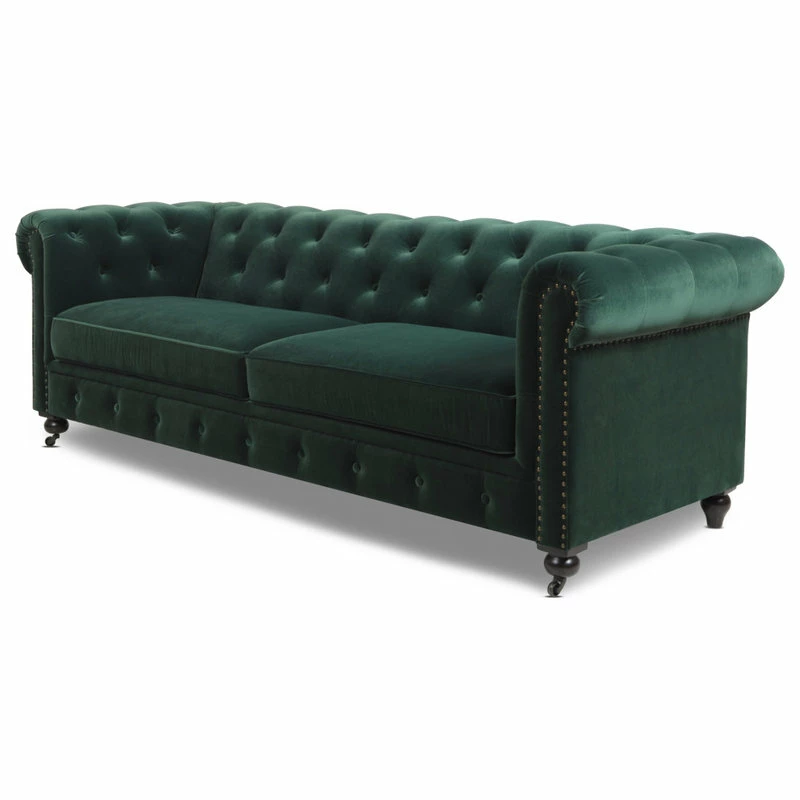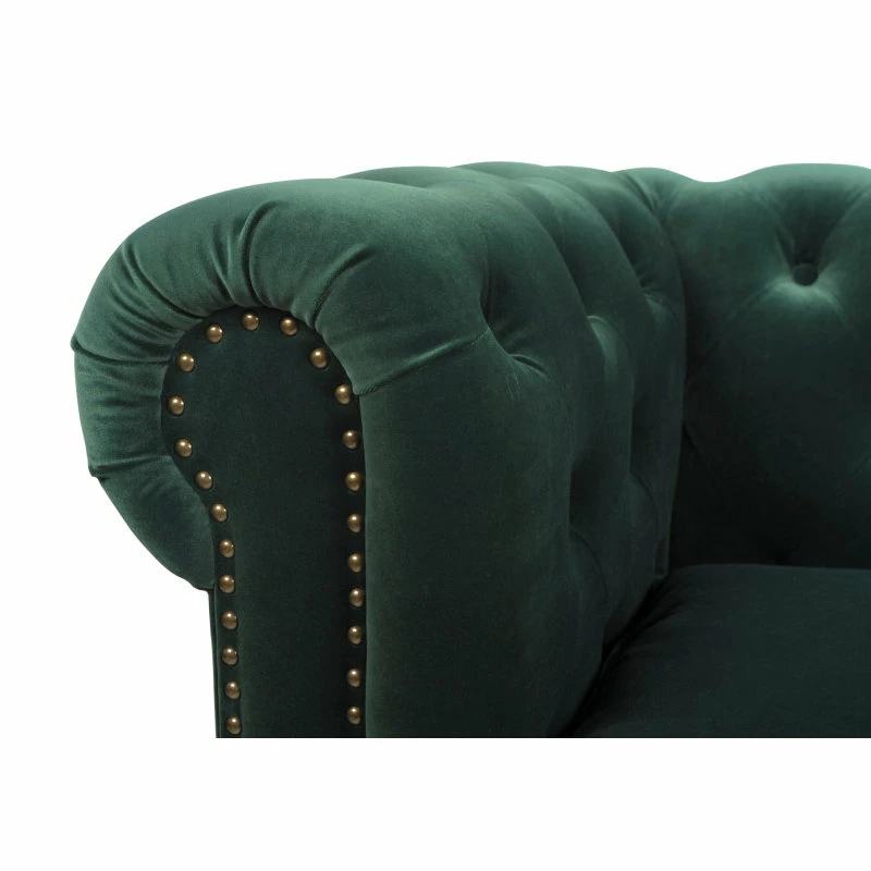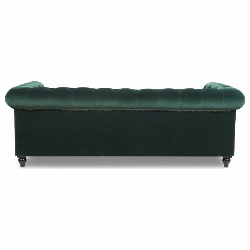 - Classic Chesterfield silhouette with rounded arms and back and tall, shelter arms