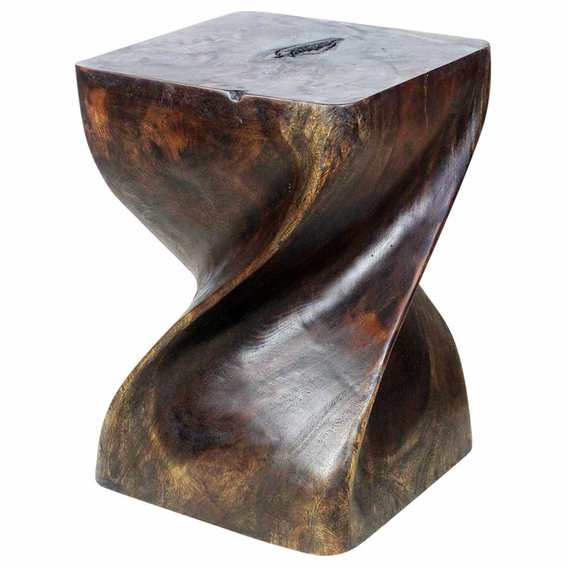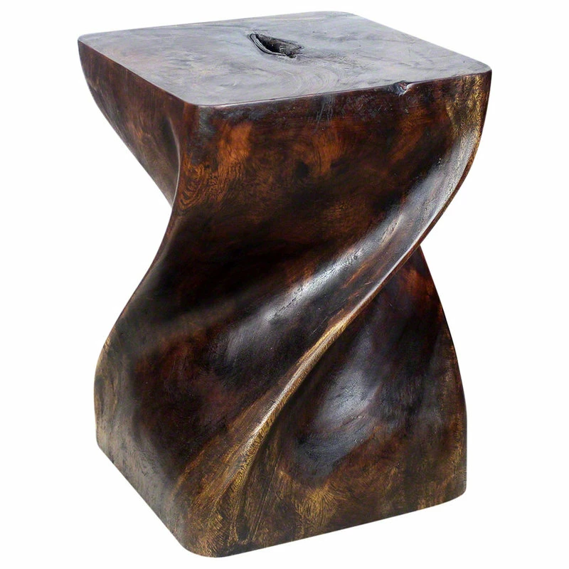 Revel in the simplistic beauty of the Sustainable Wood Big Twist Stool Embrace the sense of calm it exudes. Admire the deceptively easy design. Very impressive, this elegant piece can serve as an end table, display stand, or a stool for last minute seating. Two together can make a coffee or sofa table. At 14 inches Square x 20 inches high and finished with Mocha Oil