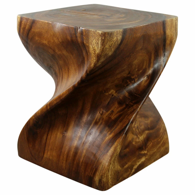 Life is already cluttered with enough drama and commotion. Revel in the simplistic beauty of the Big Twist End Table. Embrace the sense of calm it exudes. Admire the deceptively easy design. Each is hand carved – no two are alike. At 16 inches square by 20 inches High finished in brown Walnut tone oil. This elegant piece can serve as an end table, display stand, or a stool for last minute seating