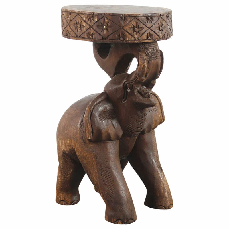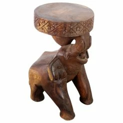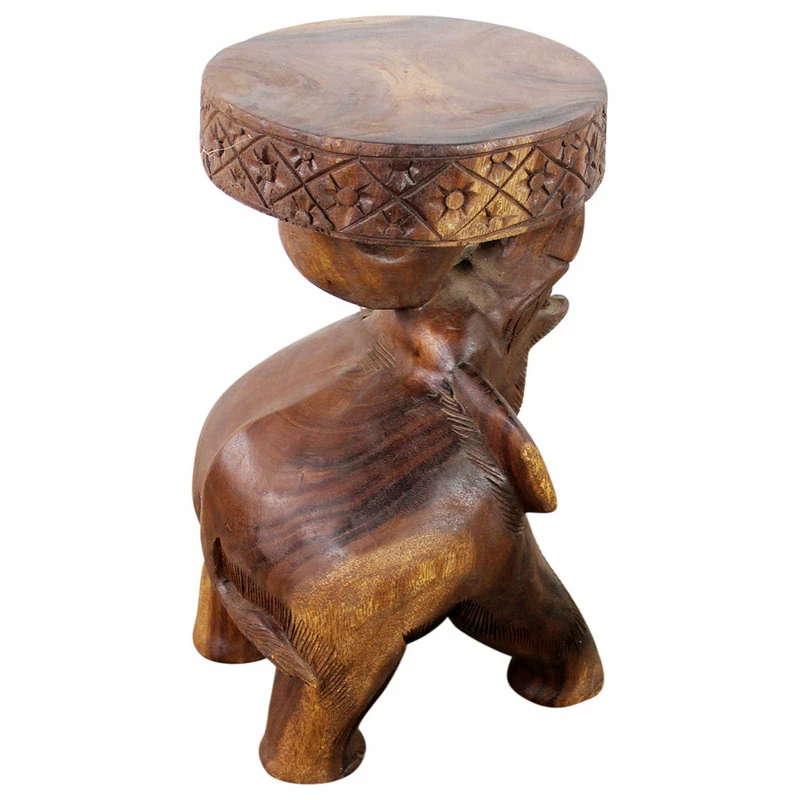 The Elephant, or Chang in Thai, is revered for its strength and gentleness. A hand carved rendition supporting a round flat surface. This hand carved elephant stool can also be used as a coffee table, a plant stand or phone stand. At 11 to 12 inches in diameter and 20 inches high finished in Walnut tone oil.