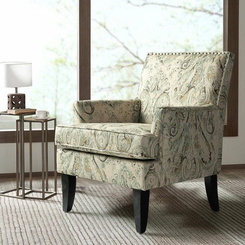 Classic style and contemporary design combine in this inviting armchair. Founded on a solid birch wood frame, this chair strikes a club chair silhouette with a slightly slanted backrest, clean track arms, and tapered block feet. Its classic design along with its gorgeous pattern and gleaming nailhead trim makes this chair a must-have in any home. It will be suitable for those urban dwellers with limited space.