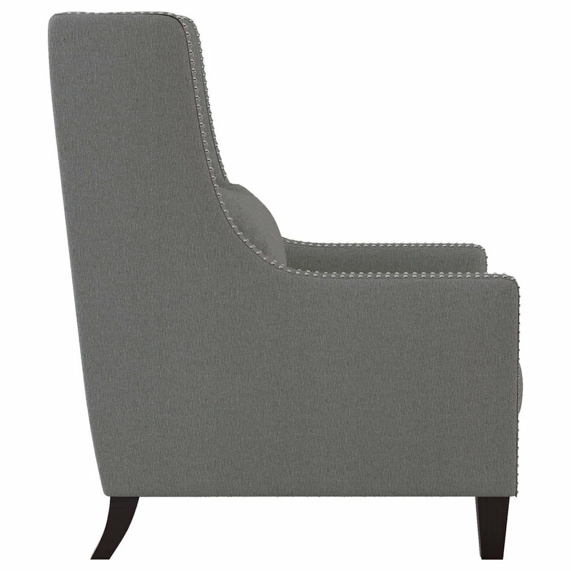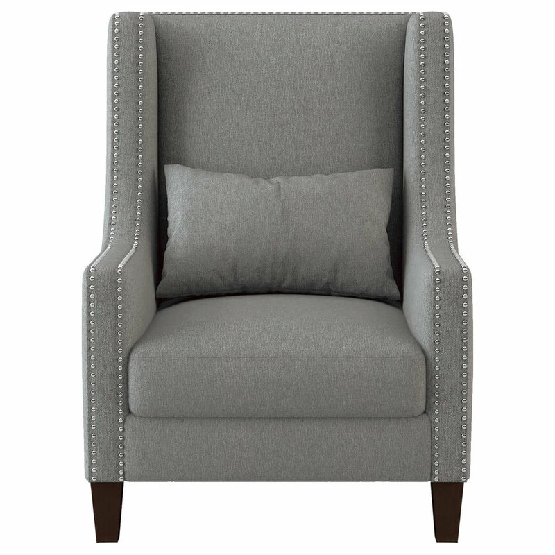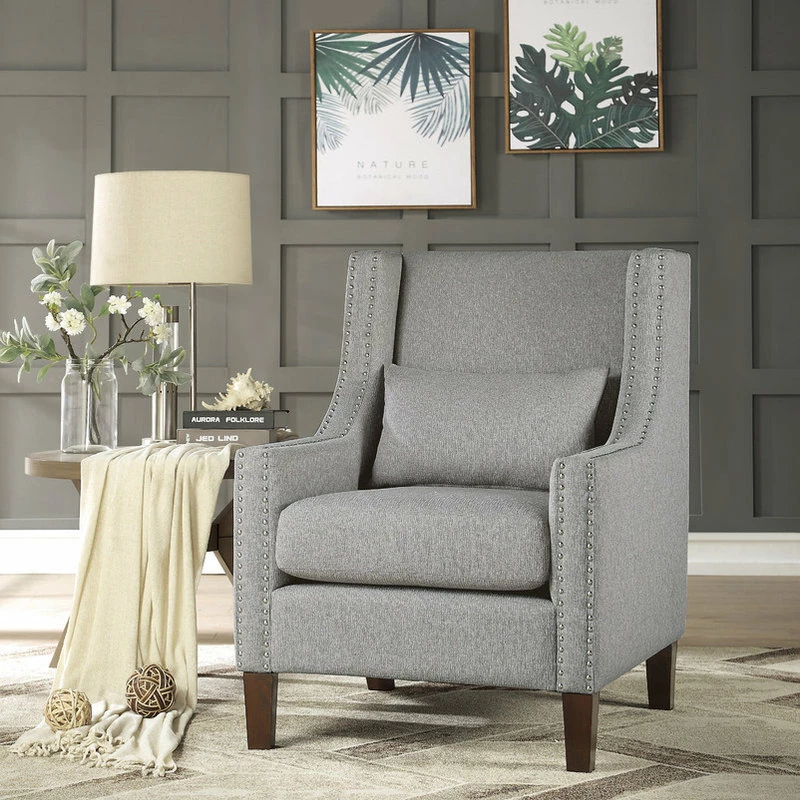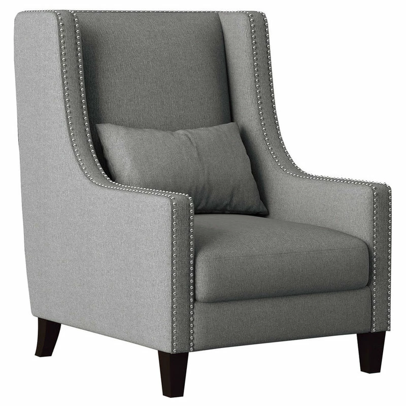 Modern-traditional styling is perfectly executed in the design of Waterlyn Collection. The high-back profile of this elegant accent chair is defined by nailhead trim and its seating is enchanced by the back-supporting kidney pillow. This accent chair is offered in two fabric options – light gray and dark gray – for versatile placement within your decorative scheme.
