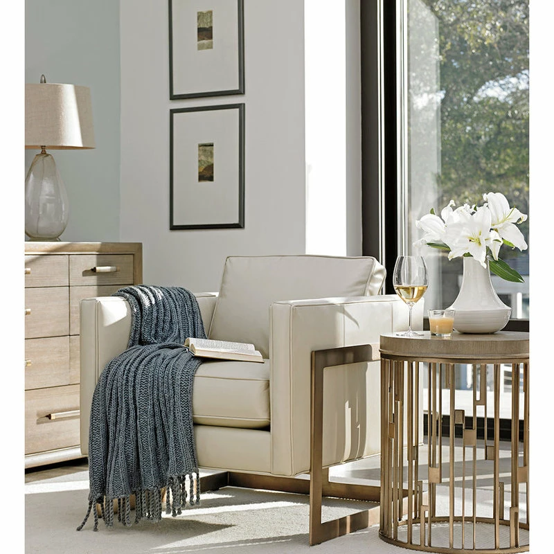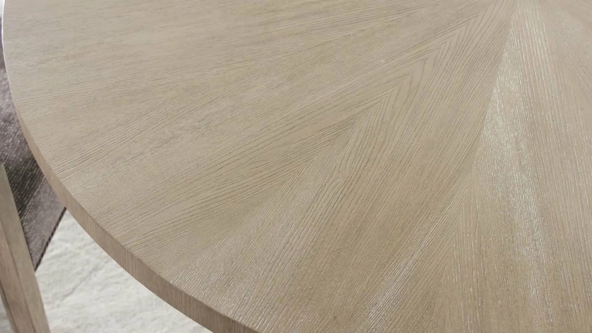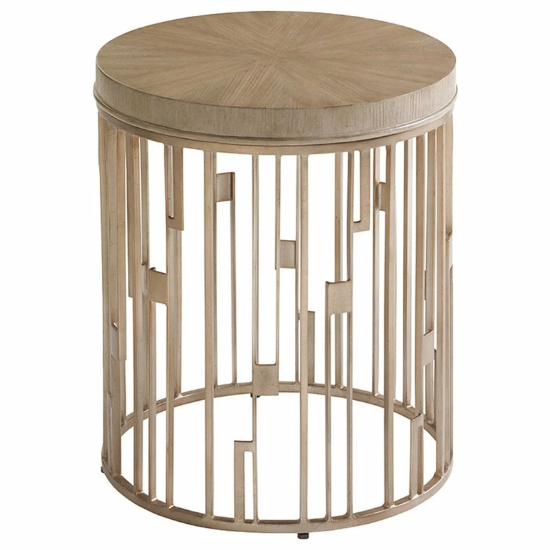 The round accent table showcases the balance achieved when great design unites wood and metal. The Gray Elm top is paired with a base finished in a burnished silver leaf. The piece was inspired by a city landscape at sunset where the resulting expression of light creates a play on shadows. The motif is carried throughout the group.