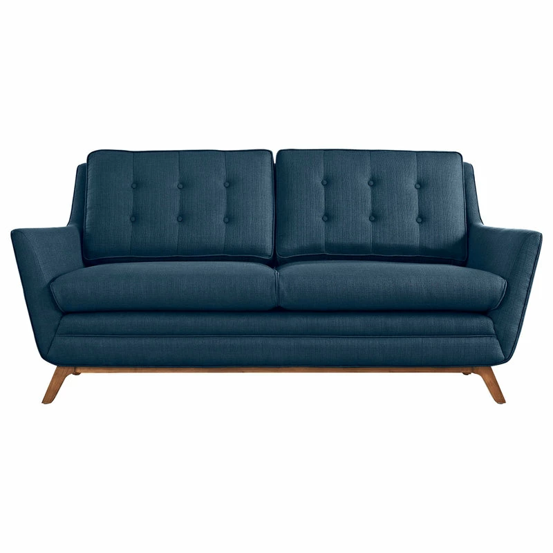 Dominate your decor with the expertly designed Beguile Collection. Exquisitely crafted with gently sloping arms, comfortable plush seat cushions, and adeptly tufted back cushion buttons, Beguile is a delightful collection that reinvents mid-century style. Outfitted with a solid wood walnut-stained base and fine fabric, Beguile comes perfect for living room, lounge and meeting areas.