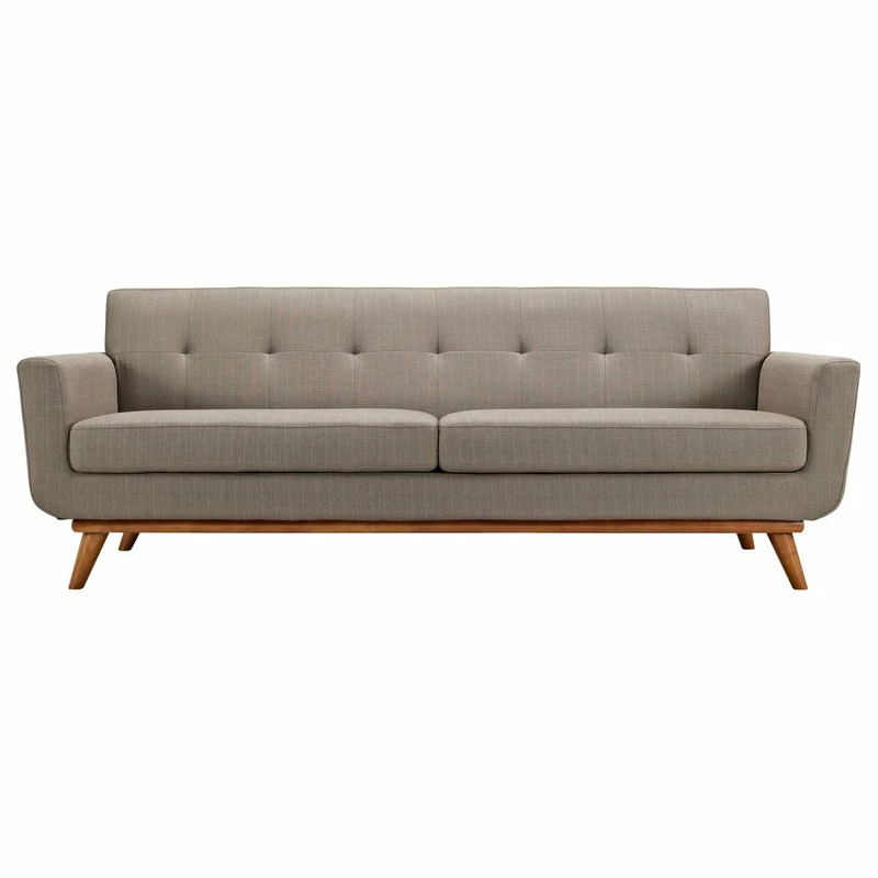 Gently sloping curves and large dual cushions create a favorite lounging spot. Whether plopping down after a long day at work, settling in with coffee and brunch, or entering a spirited discussion with friends, the Engage sofa is a welcome presence in your home. Seven tufted buttons create eye-catching appeal, adding depth that brings your sitting decor to center stage. Four cherry color rubberwood legs and frame supply a solid base to the comfortable upholstered material.
