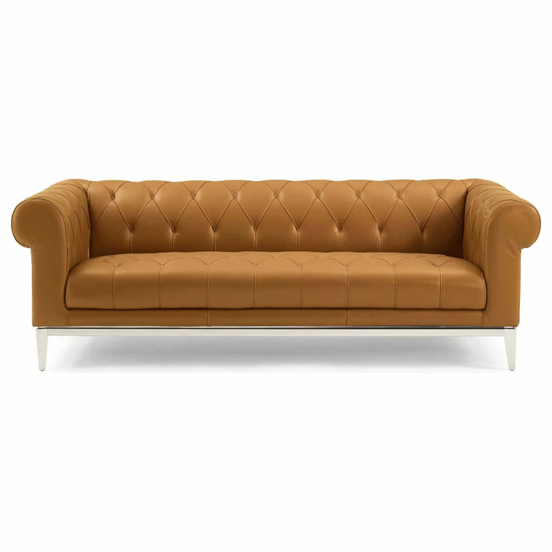 Rollick in the luxurious expanse of the Idyll Leather Chesterfield Sofa. Featuring soft leather upholstery, rolled arms and tufted button accent details, dense foam padding, and a sinuous spring system for responsive support, Idyll creates a lushly comfortable seating environment that invites lingering conversations and leisure time. This 84-inch sofa comes with elegant leather upholstery in this designer couch sure to become the focal point of your home. Supported by a sturdy polished stainless steel frame, enhance your living room decor with the timeless look of this vintage sofa couch. Weight Capacity: 900 lbs.