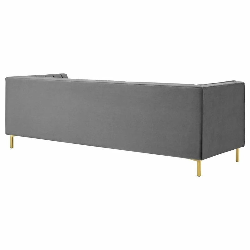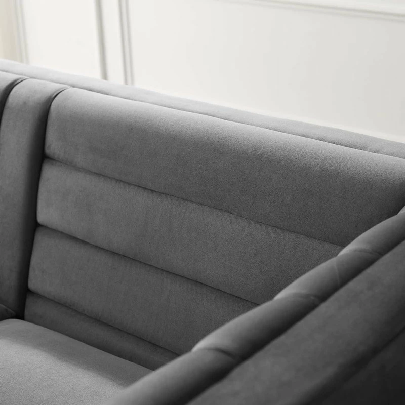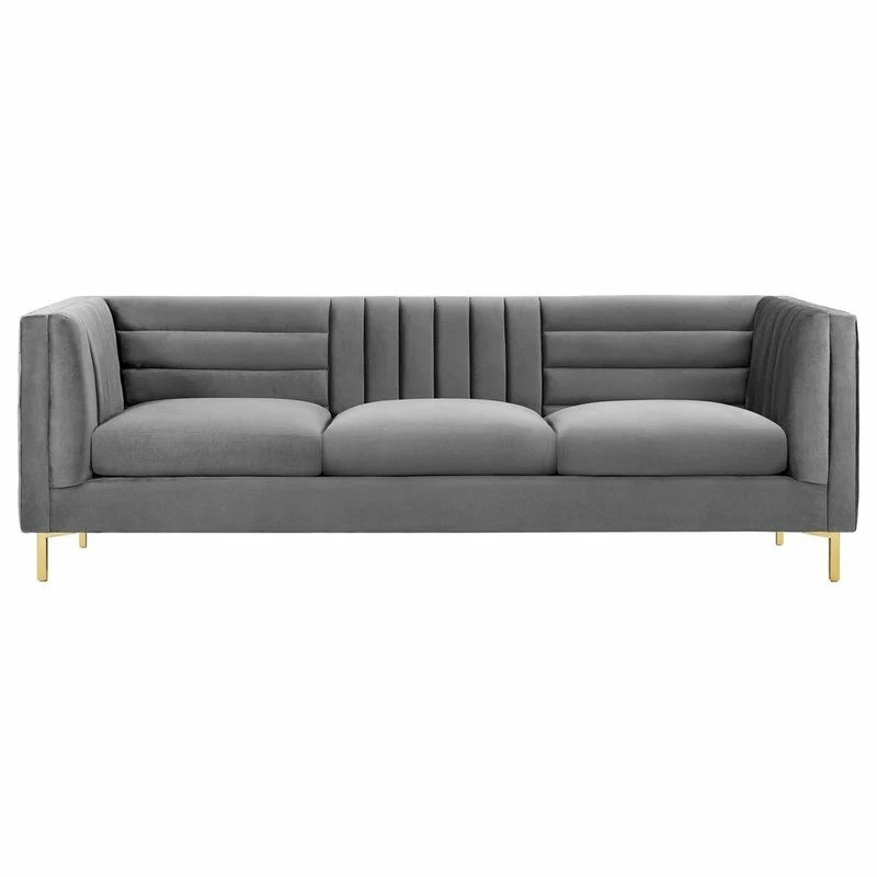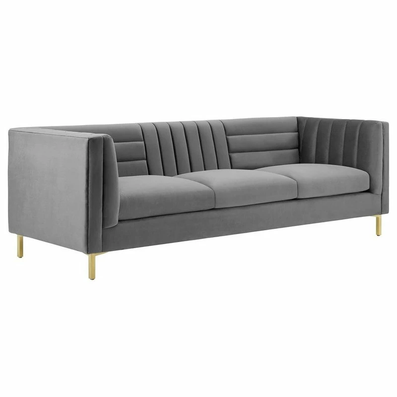 Regale visitors from the exquisite comfort of Ingenuity’s luxe perimeters. This retro-modern sofa features a visually contrasting channel tufting that introduces an energetic and lively welcome for your living room or lounge area. Soft, stain-resistant performance velvet upholstery covers the sofa’s solidly constructed wood frame. Ingenuity features dense foam cushions for a premium seating experience. Four stylish gold stainless steel legs offer solid support in this comfortable centerpiece for the modern home.
