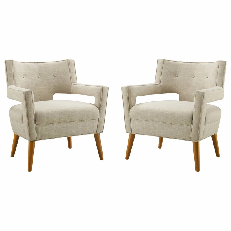 Carefully crafted simplicity and subtle sophistication blend to create the crafted simplicity of Sheer Armchair Set of 2. A mid-century modern armchair set upholstered in soft polyester fabric, Sheer features a streamlined profile and flared armrests for a striking silhouette. Complete with elegant button tufting and subtle piped trim, Sheer comes with dense foam padding positioned on a sinuous spring support system for exceptional comfort. Outfitted with tapered and splayed non-marking, cherry-stained wood legs, the Sheer Upholstered Fabric Armchair Set of 2 delivers the perfect seating area for the living room, home office, or entryway.