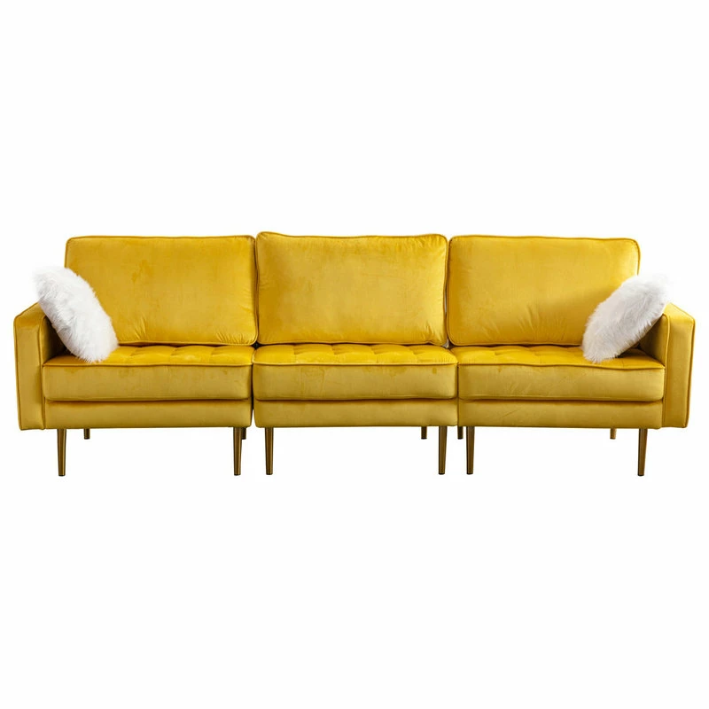 The timeless style of the Theo sofa makes a cozy addition to your living space. Its soft velvet upholstery, cushioned back, tufted seating, and gold tone metal legs combines both comfort and style. The included soft texture faux fur pillows will enhance the decor to your living space, while also providing extra comfort and support when relaxing on the Theo sofa. This beautifully styled and luxuriously comfortable seating meets your needs for relaxation and entertainment for you and your guest!