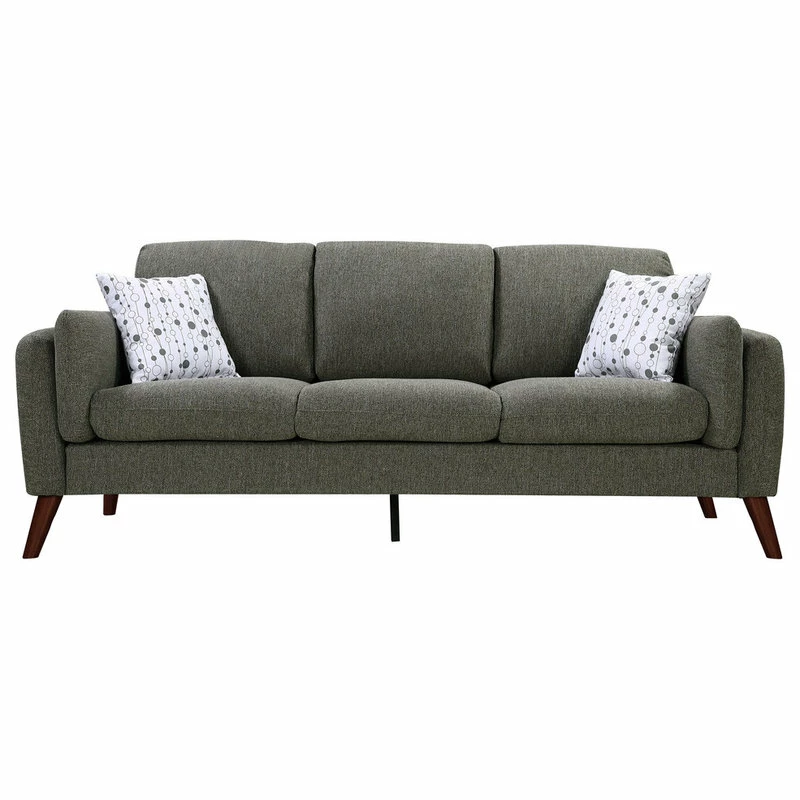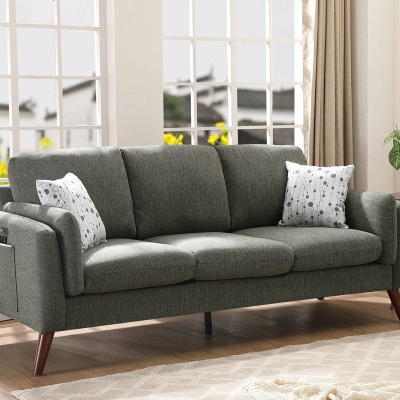 Winston Gray Linen Sofa Couch with USB Charger and Tablet PocketComfort, Style, and Quality! These are the words that define the Winston Collection. This mid-century modern sofa comes with 2 pillows, USB charging ports, and magazine/tablet storage pouch. The square arms and round tapered solid wood legs offers the trendiest look for your home. Perfect for any living room, this beautiful couch will allow you to impress and entertain your guests!