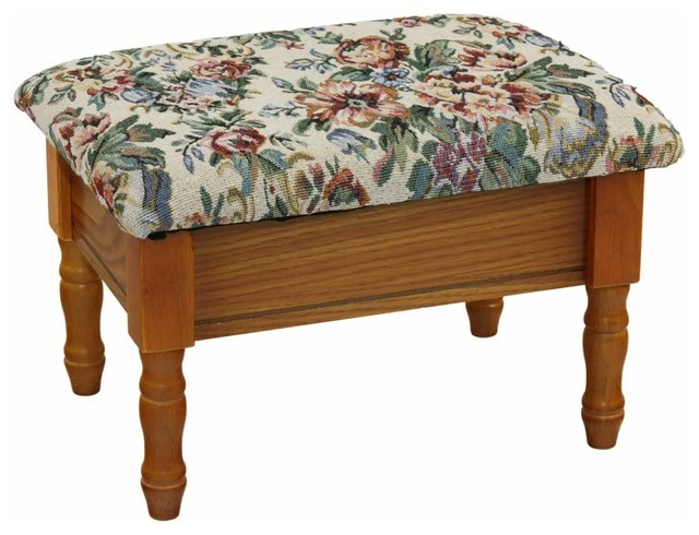 Foot stool with padded top conceals handy storage compartment. Seat fabric is woven of high quality fibers and is very durable. Item is crafted to perfection to match the beauty of your bedroom decor. No standing on footstool