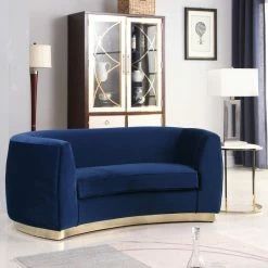 Get comfy while remaining chic in this elegant Ritz grey velvet sofa. Plush grey-colored upholstery provides a soft texture that is pleasing to the senses, while its curved design offers a contemporary touch to your home furnishing. Gold metal legs complement the sofa’s sophisticated grey color, creating a gallant piece anyone would be proud to display in their home.