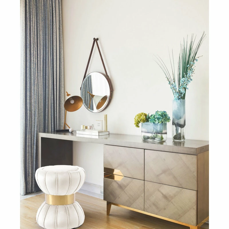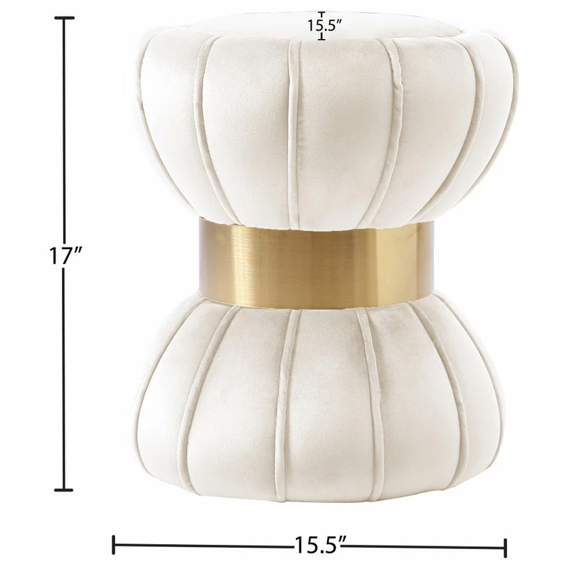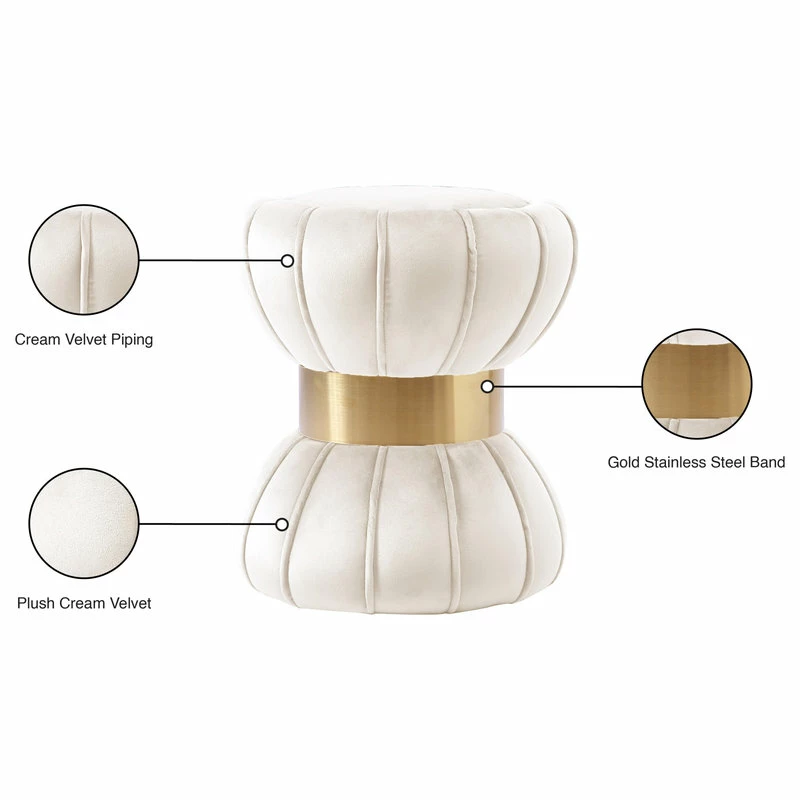 Add modern sophistication to your living space with this chic cream velvet Vino ottoman stool. Plush cream velvet curves are bound by a gold stainless steel band in its center, creating an hourglass shape that is edgy and complements your contemporary home décor. Place this lush ottoman stool next to your vanity in your bedroom, so you’ll have a comfy place to sit while you do your hair and put on your makeup.