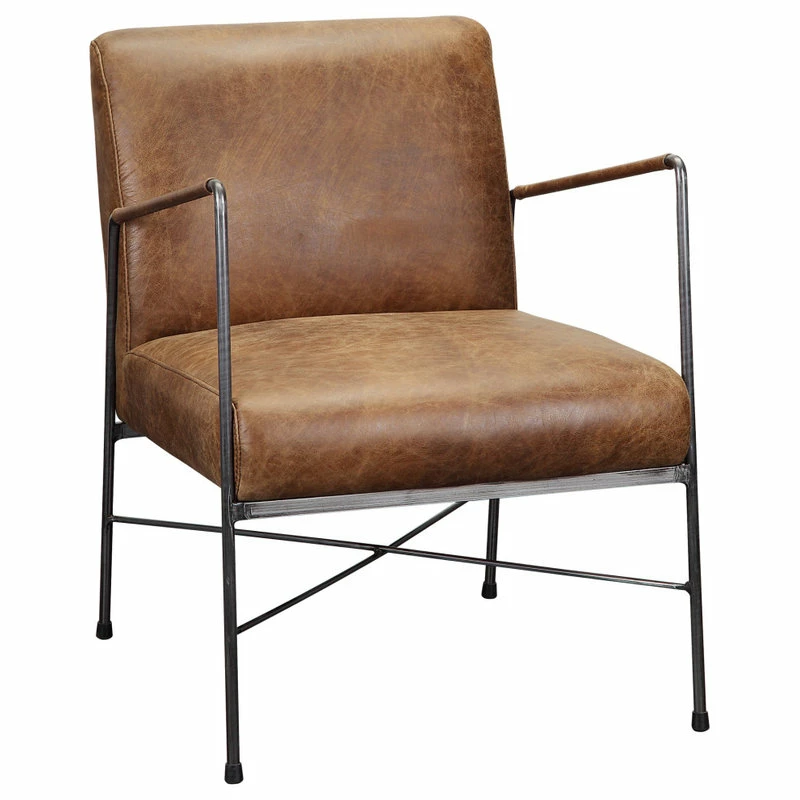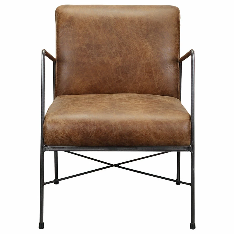 Accent your space with minimal, industrial design. A clean, comfortable addition to any decor, the Dagwood armchair ties together an earthy color palette with its warm top-grain leather and slim iron frame for a complete, modern look. In style with flexible intention to float from room to room, less is so clearly more with this occasional chair.