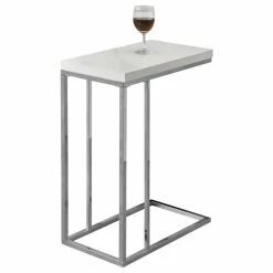 What a convenient way to eat or drink on your couch. This beautiful glossy white finished hollow-core accent table has sufficient surface space for you to place your snacks, drinks and even meals. Its chromed metal base provides sturdy support along with a fashionable touch that will suit any decor. Sold accent table only. Other Accessories not included.