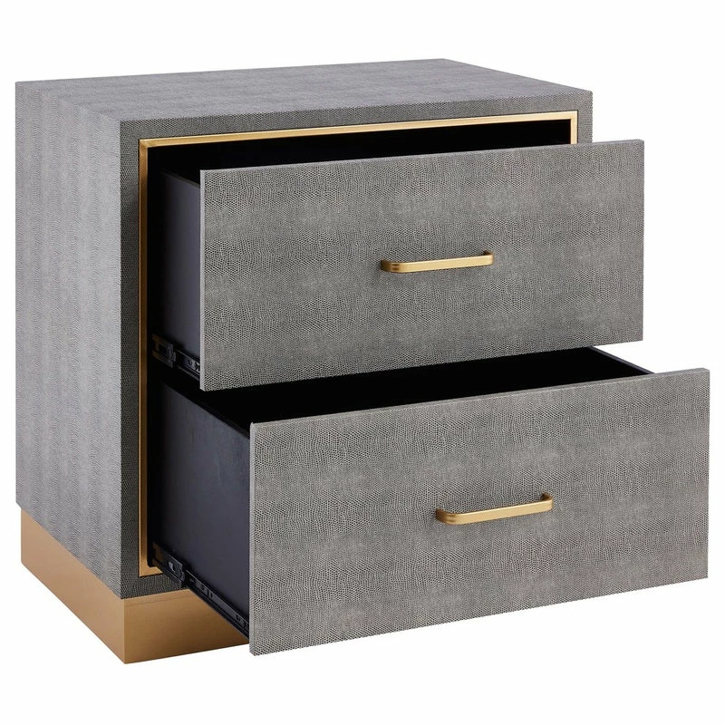Beautify the room with a touch of Hollywood Glamor with the Edinburgh Collection. Visually appealing faux shagreen upholstery adorn 4-drawer end table frame that sits atop matte gold base. Simple gold pulls and gold trimming complete the ensemble. Fully Assembled. Available in Chronicle Gray and Gold. Matching cabinets and tables are sold separately.